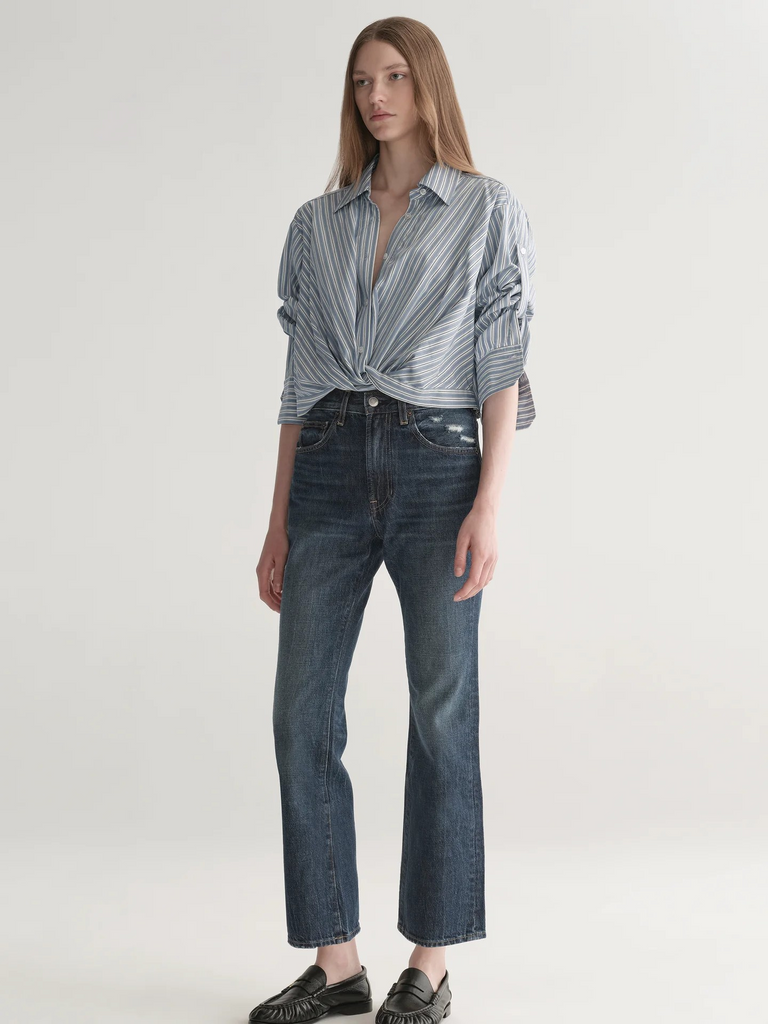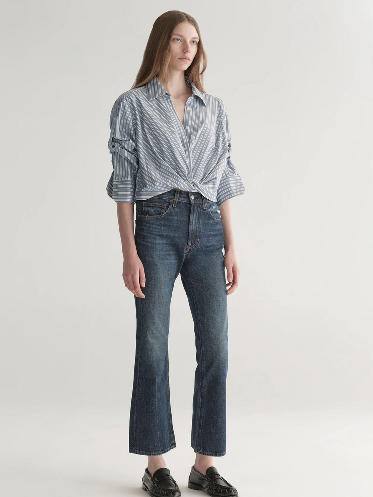 The Leo Shirt by A.L.C. is crafted from crisp 100% cotton in a vertical shirting stripe of white and steel blue. This cropped button-down silhouette features a sharp collar, convertible long sleeves, and a twisted hem detail that hits at the navel for a relaxed, modern shape.