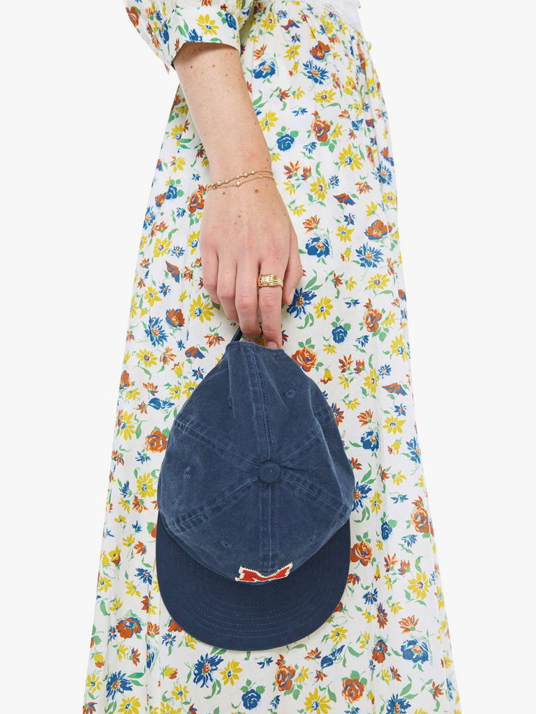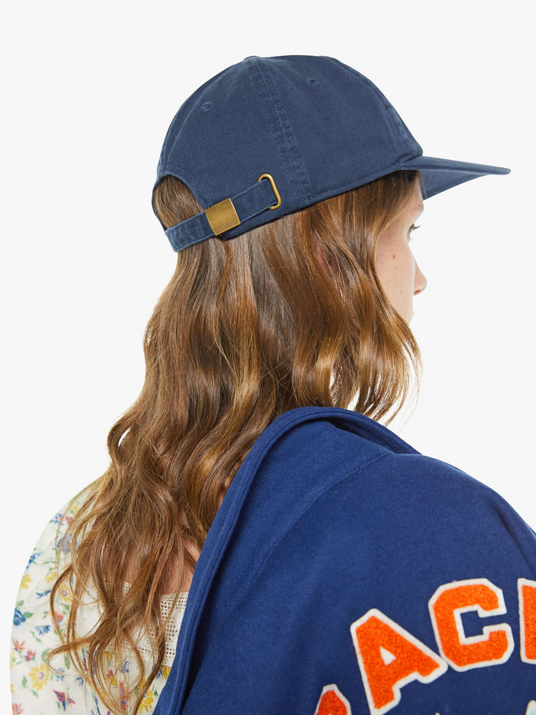 Think fast. A dad hat by Mother Denim designed in navy 100% cotton with an M embroidered in red and white on the front.