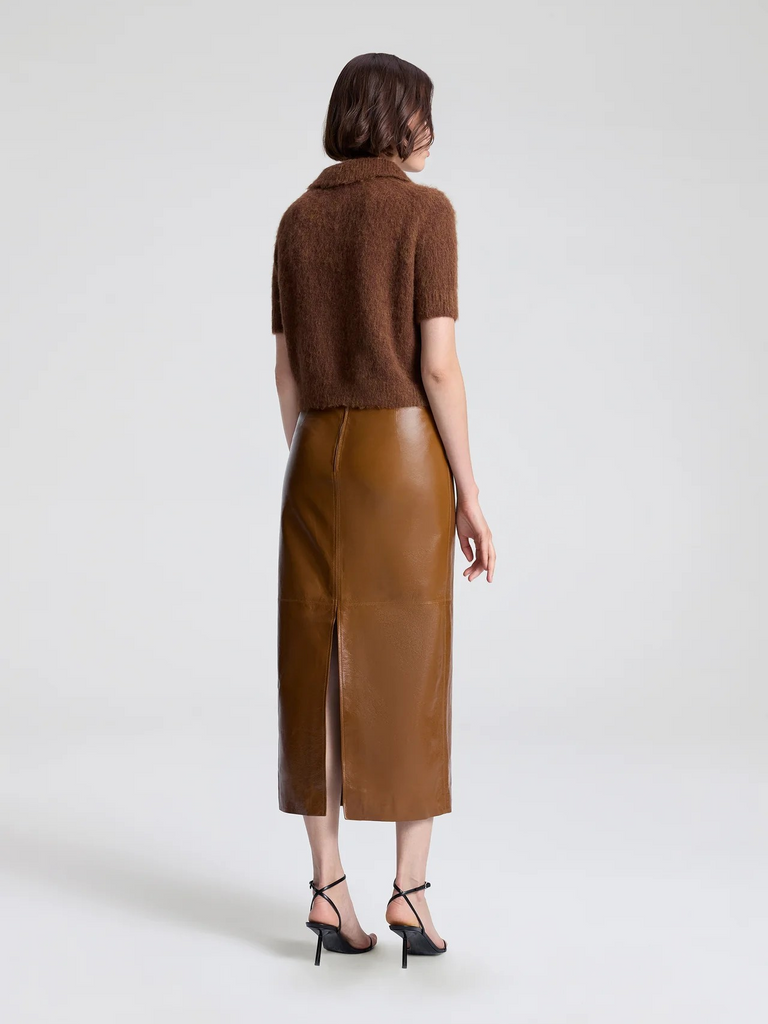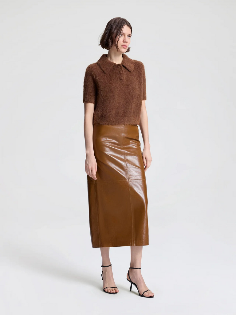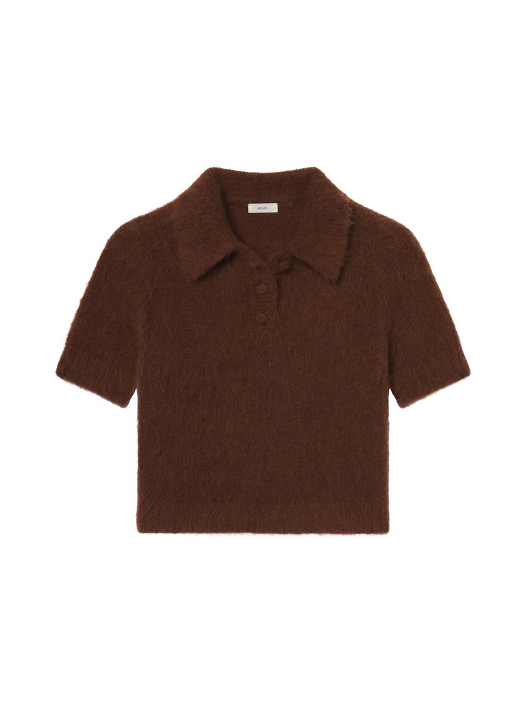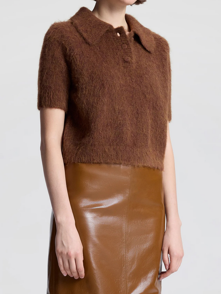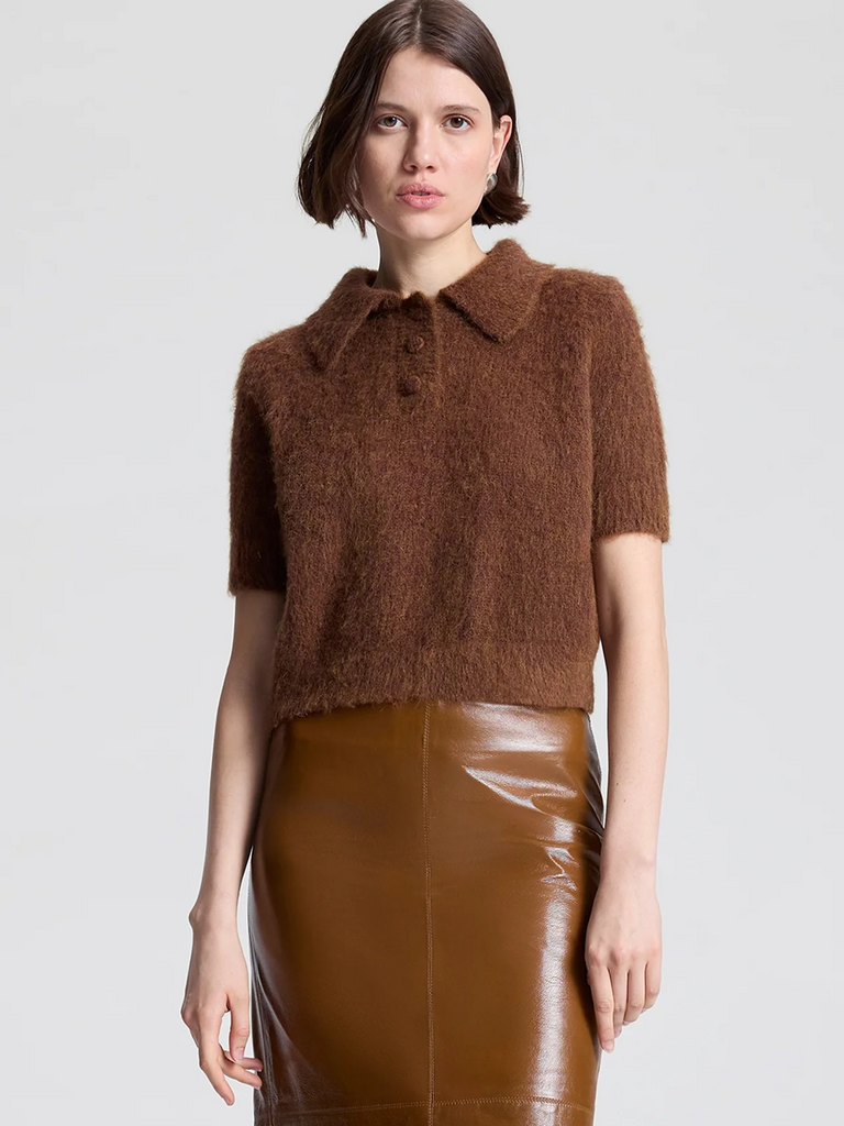 The Gio Top by A.L.C is brushed alpaca that ends softness and lightness to this collared knit, detailed with matching buttons, mid-length sleeves, and a cropped hem.