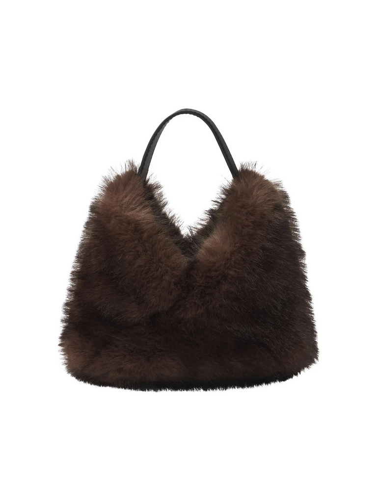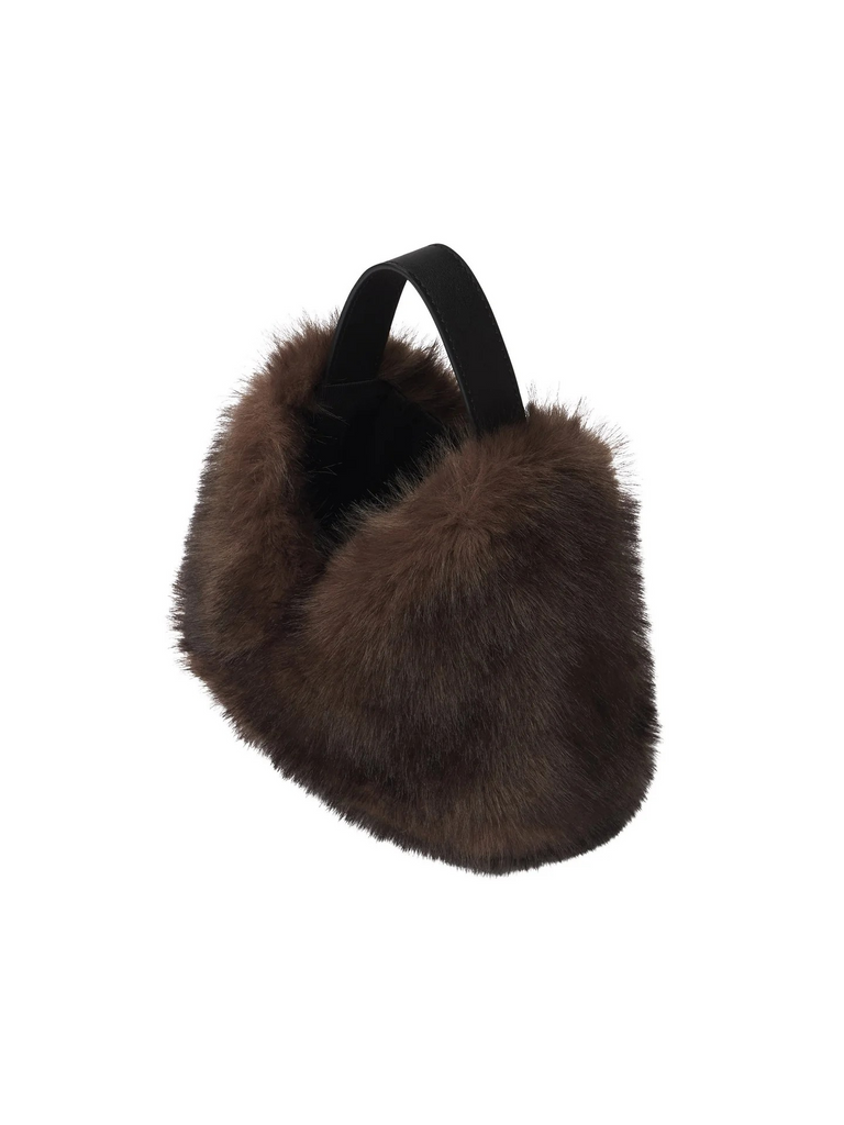 The Sia Bag by ALC is crafted from plush faux mink in a rich brown tone. Its softly geometric silhouette contrasts the tactile richness of the fur with clean, structured lines, while a smooth leather handle adds polish.