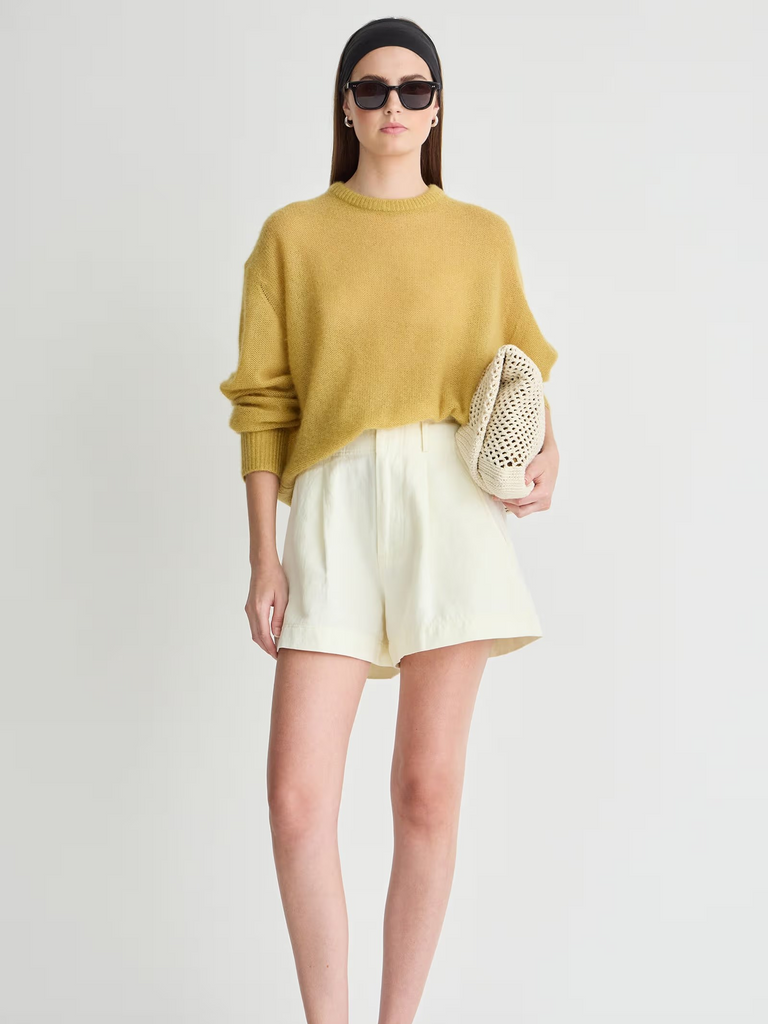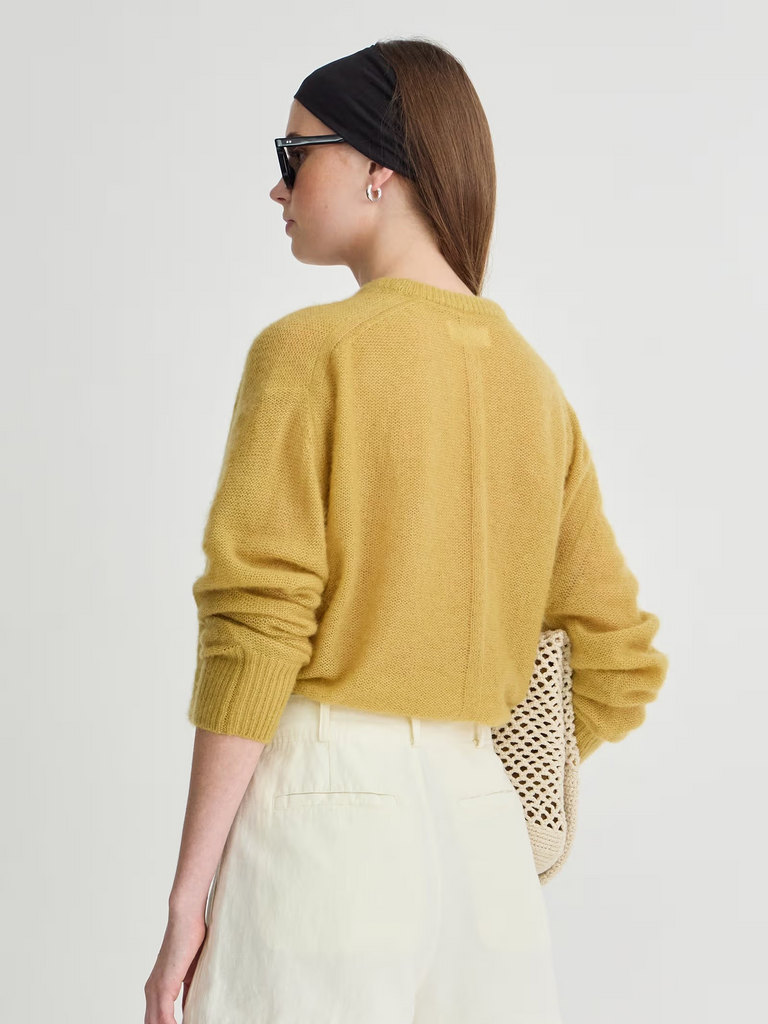 A super soft lightweight layer by Apiece Apart that we're styling endlessly with skirts, trousers, and our favorite pair of denim. Crafted from a luxe cashmere/silk blend.