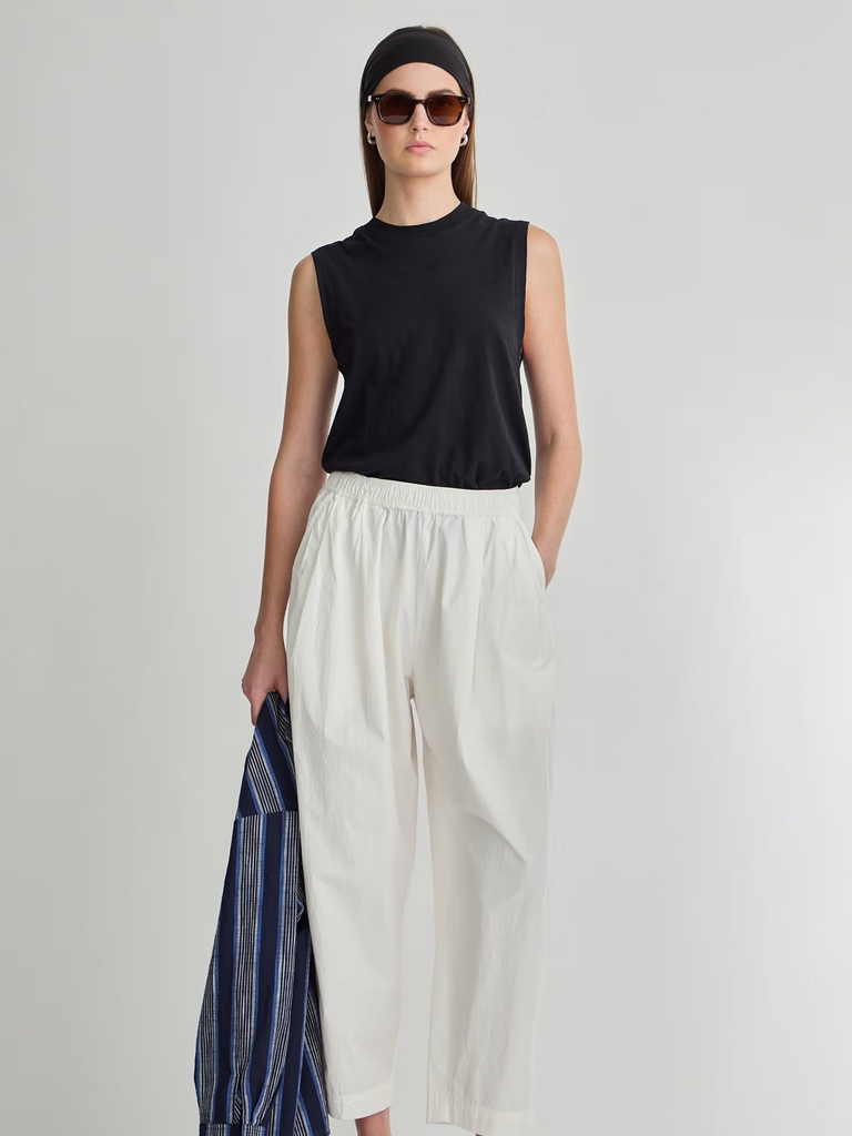 We’re styling this easy-to-wear staple pair by Apiece Apart with everything in our closet, from simple tanks to lightweight cotton blouses. The Spa Pleat Pant offers an elastic waistband, front pleats, dropped crotch, barrel shape leg, front slant pockets and back patch pockets.