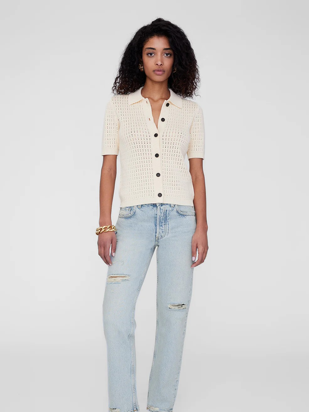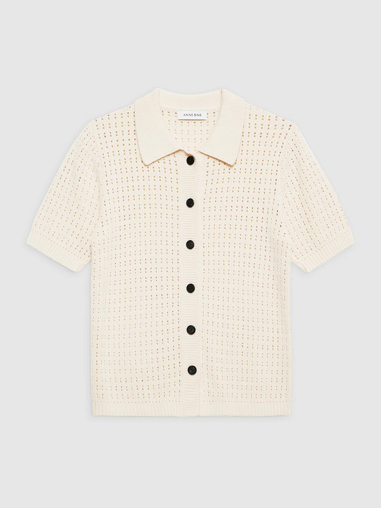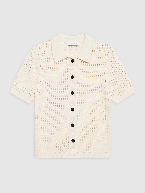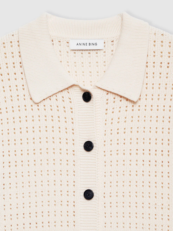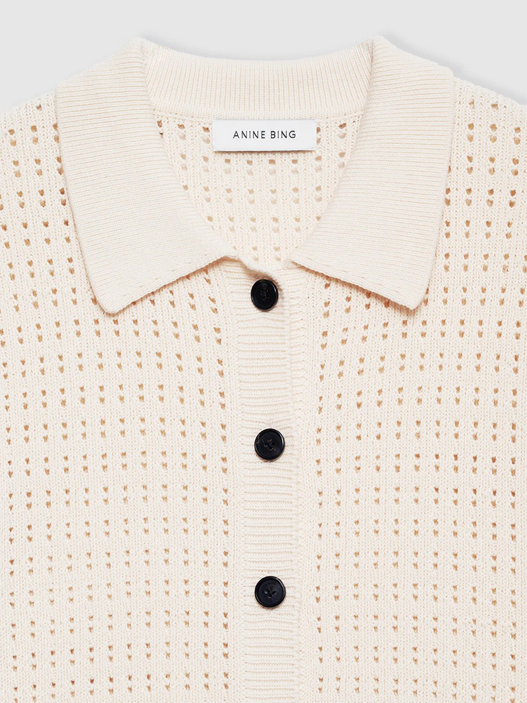 The Alexis Sweater by Anine Bing is made from an organic cotton-viscose crocheted fabrication in cream. This versatile separate features a tailored collar and faux horn buttons down its center-front placket.