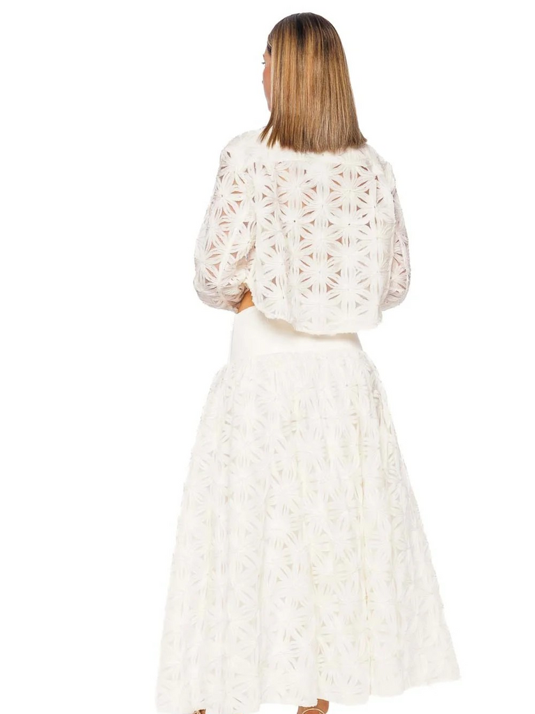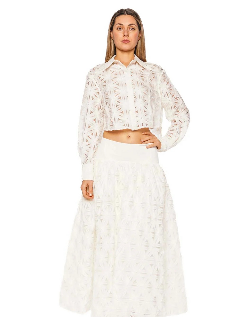 Elevate your wardrobe with the Anders Shirt by Simkhai, a masterful blend of opulence and contemporary style. Crafted from delicate sheer fabric with an intricate floral pattern, this shirt is a testament to high-end elegance, perfect for both day and night. The crisp ivory hue and tailored fit make it an exquisite choice that beautifully complements any ensemble.