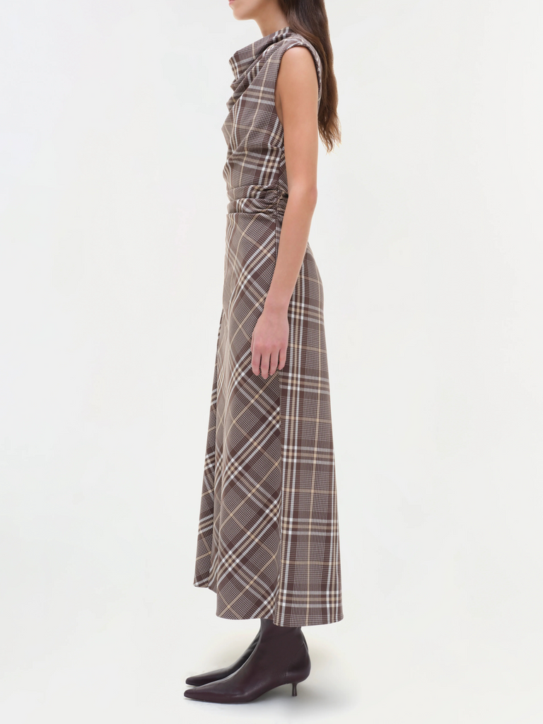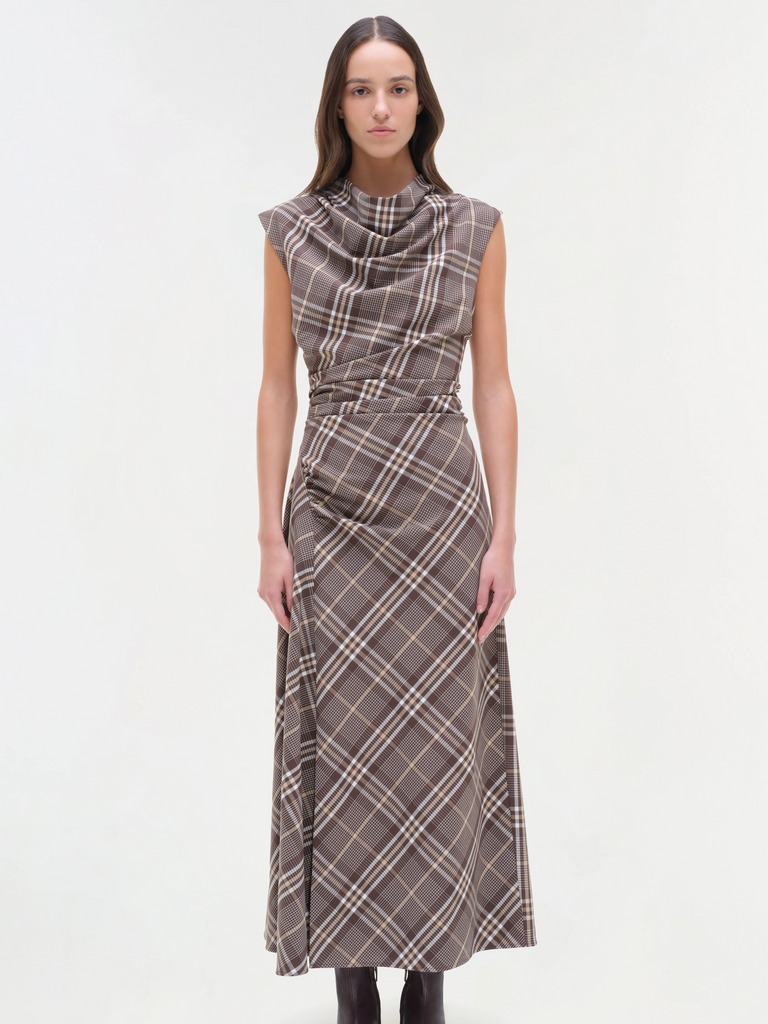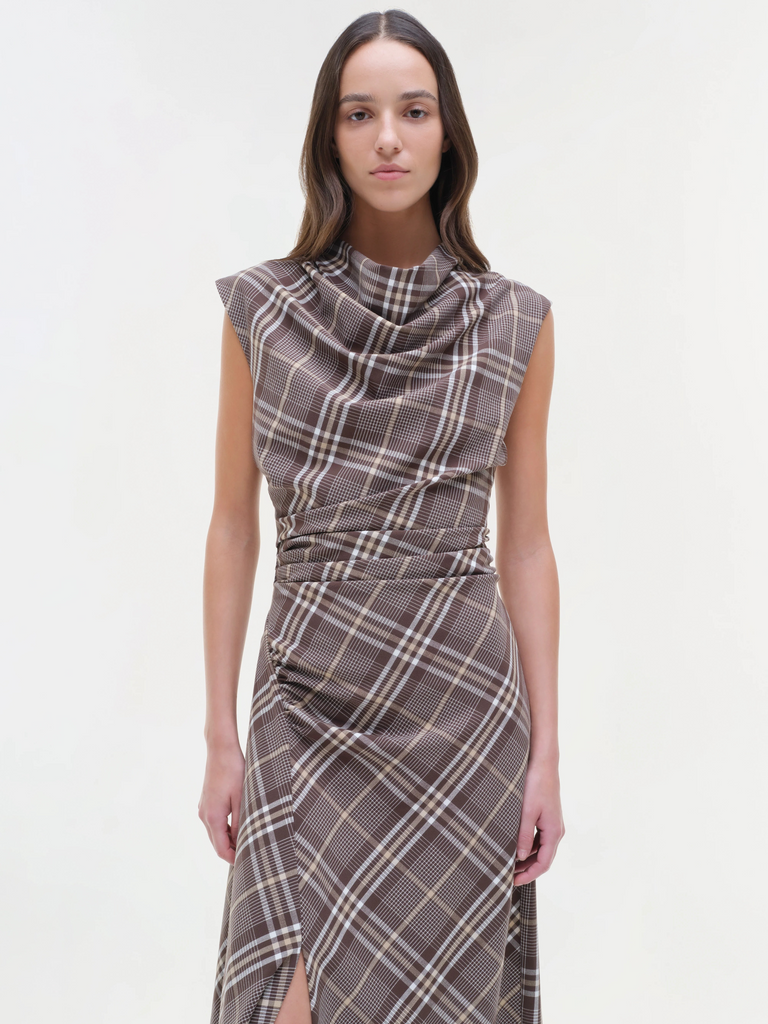 A sleeveless midi dress by Simkhai with a cowl neckline and thoughtfully gathered at the sides for an impeccably draped look.