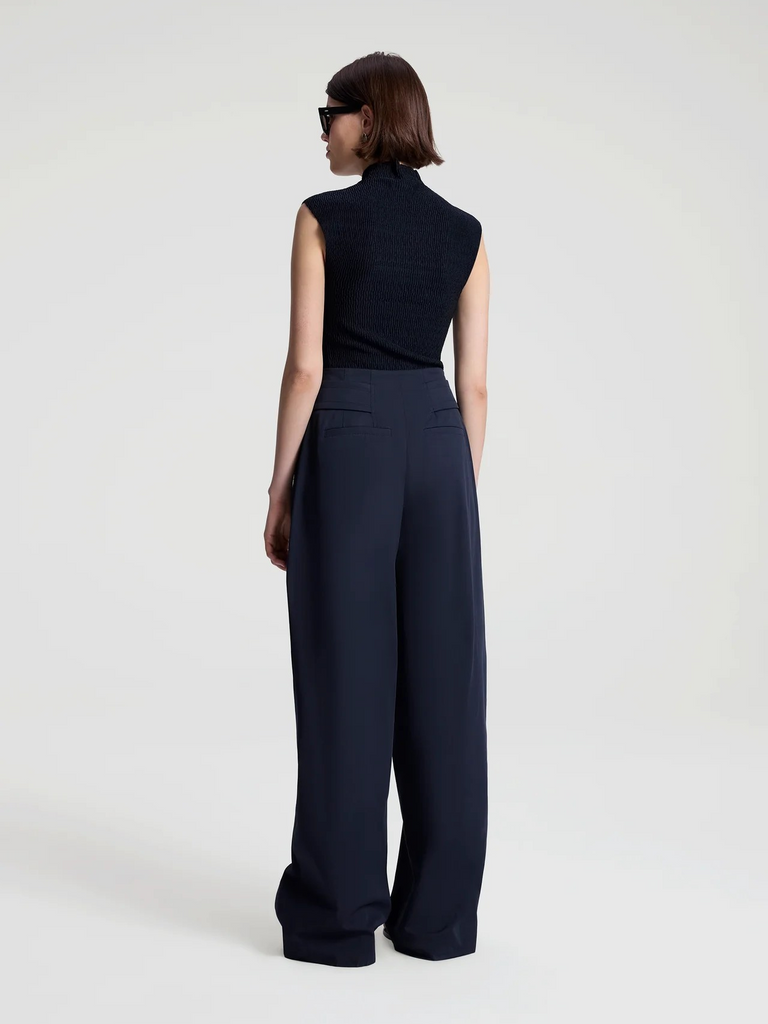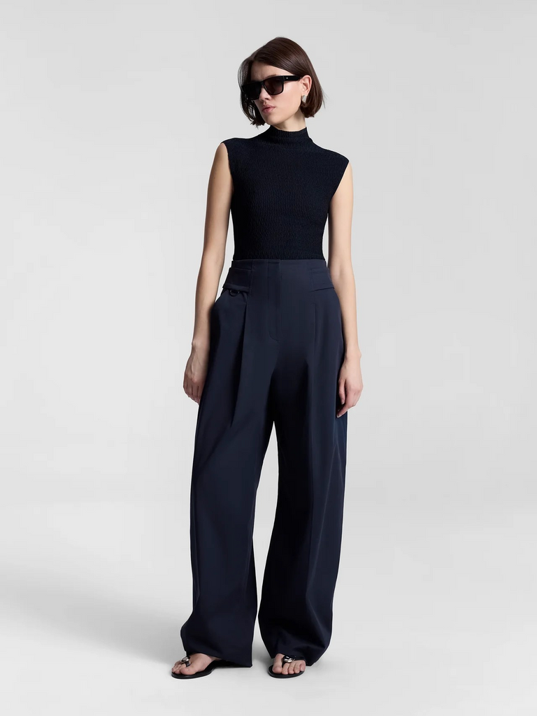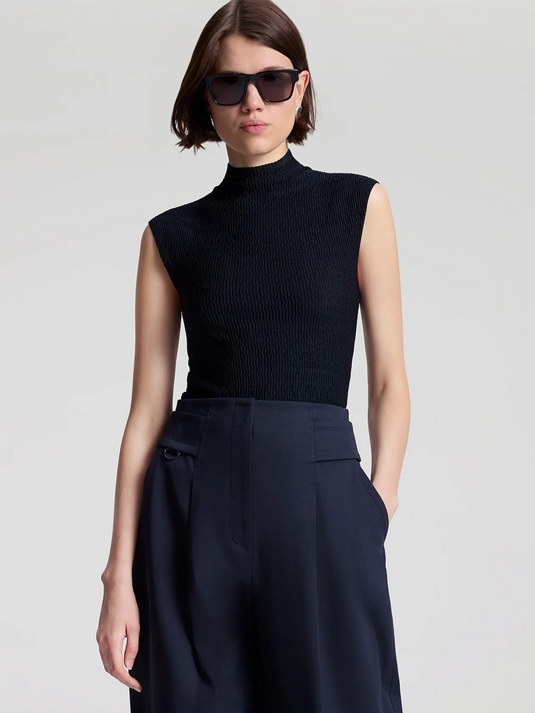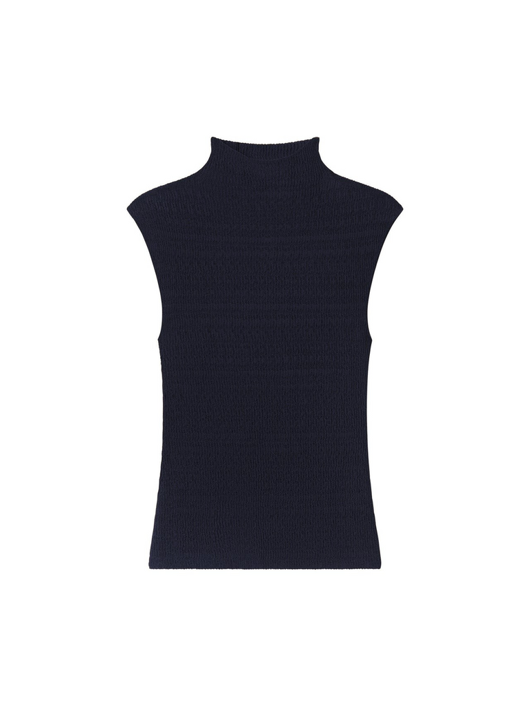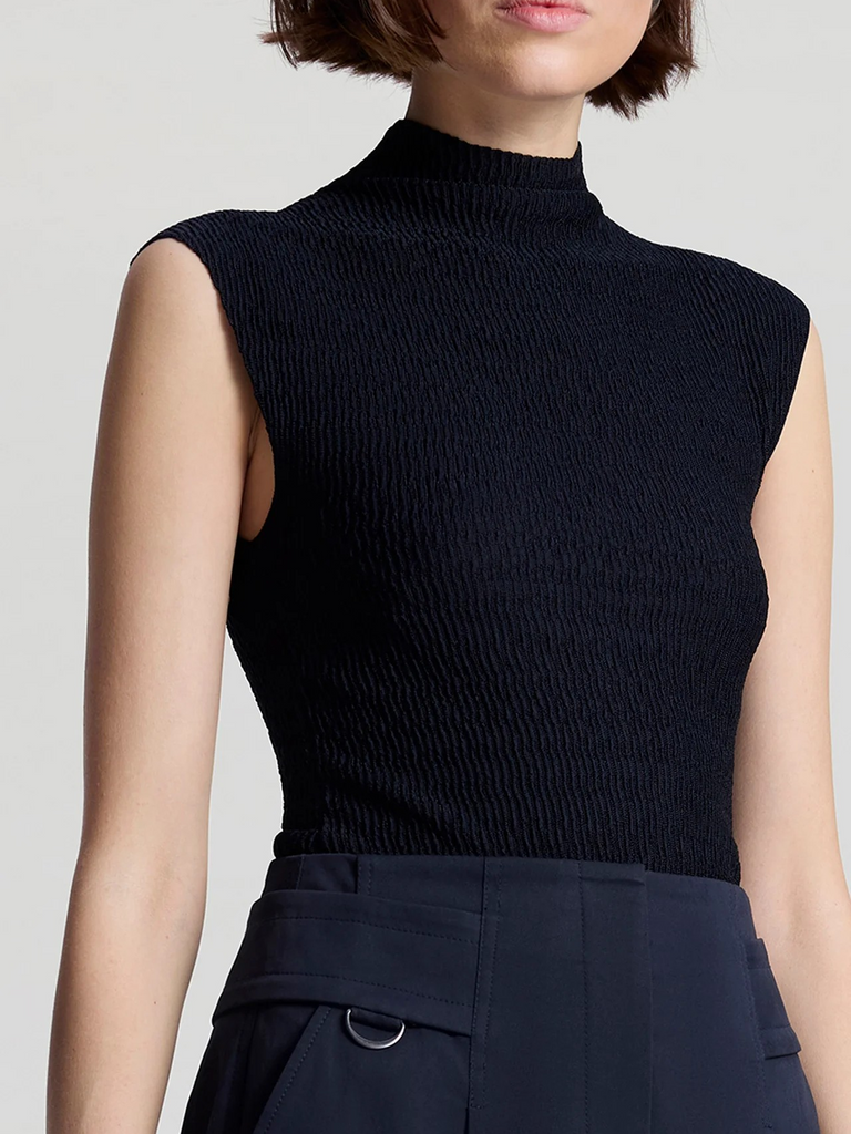 The Jada Top by A.L.C. is crafted from a softly structured knit with a finely crinkled texture in a rich navy hue. This sleeveless silhouette features a sculptural mock neck and a second-skin fit that skims the body with gentle stretch.