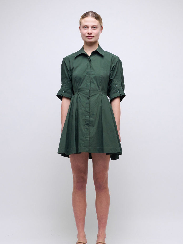 The Jazzie Cotton Mini Dress in Cypress by Simkhai. A classic silhouette, this mini shirtdress is updated with half sleeves, a cinched waist, covered button closure, and pleated skirt.