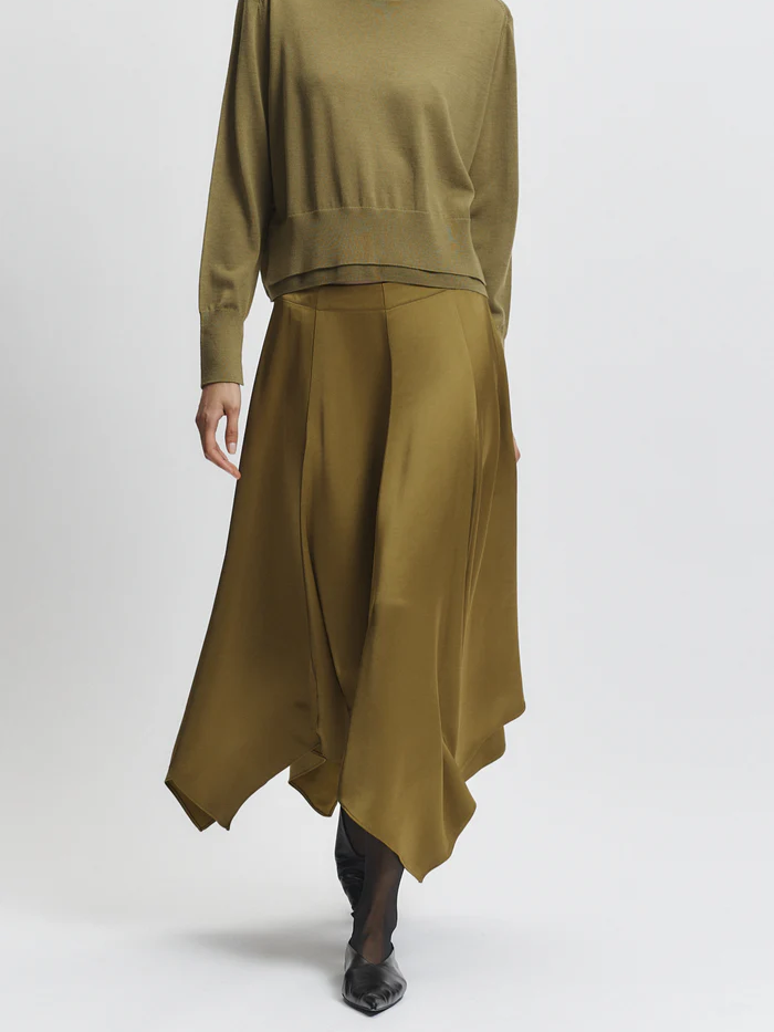 The Landon Skirt by Saint Art is a satin midi skirt that fetaures a hankerchief bottom.