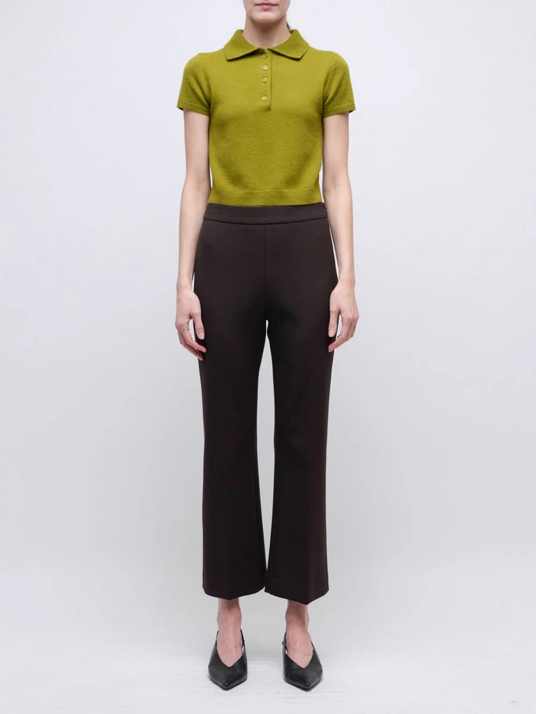 The Mackenzie Pant by Simkhai in Chocolate. These straight-leg bottoms feature a sleek, elongated silhouette with a high-waisted design. They offer a timeless look, perfect for elevating any wardrobe.