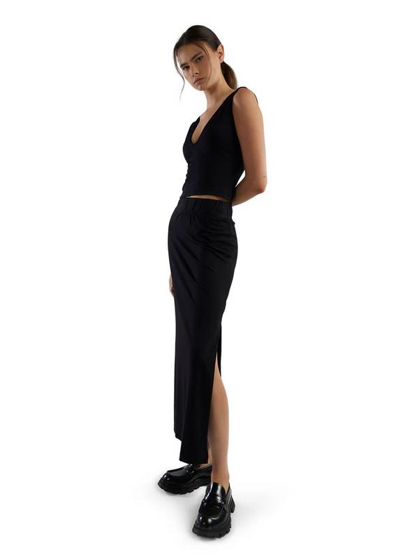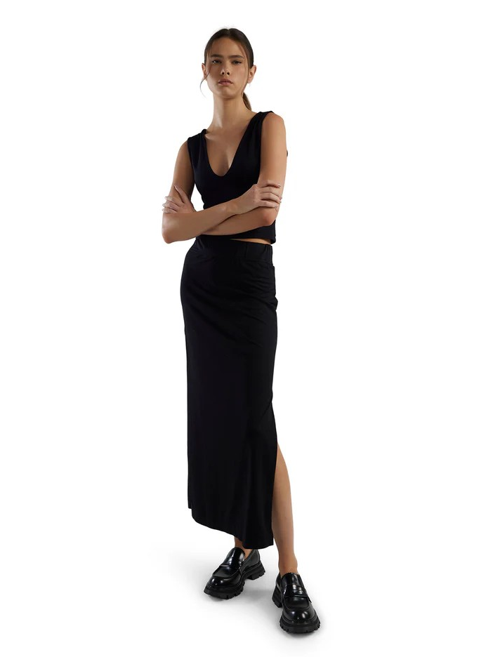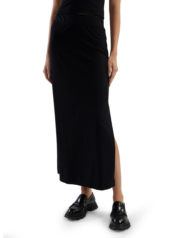 The Max Side Slit Skirt by Les Tien offers an exposed back french seam and a mid rise form fit which falls just above the ankle. The elastic waistband provides comfort without sacrificing the effortless silhouette. The luxurious knit with drape has a sheen face that provides deep rich hues, allowing timeless casual garments to be dressed up or down transforming day-to-day living effortlessly.