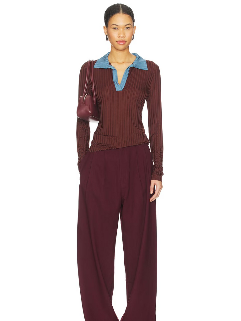 The Natalia Colorblock Long Sleeve Polo by Rag & Bone features a contrast color collar and ribbed styling.
