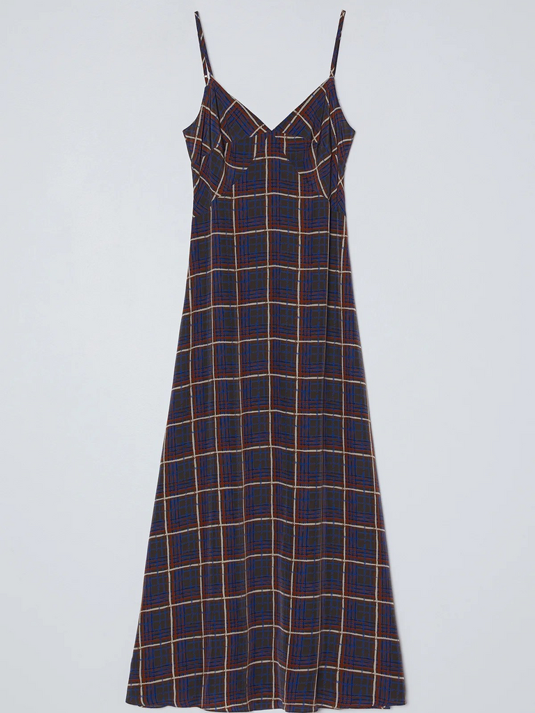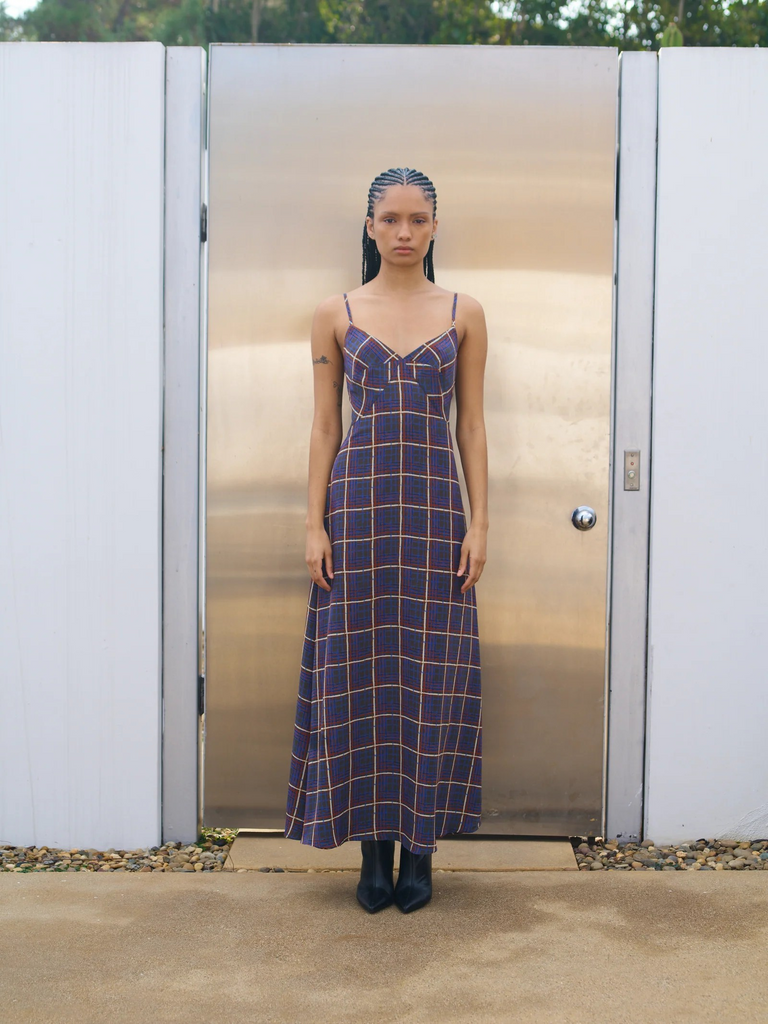 A study in line and form, the Quinn Dress by Atelier Delphine is made in a luxuriously soft recycled crepe satin. A refined slip dress with subtle structure and fluid movement. Features a V neckline, thin straps, and paneled construction for a flattering drape.