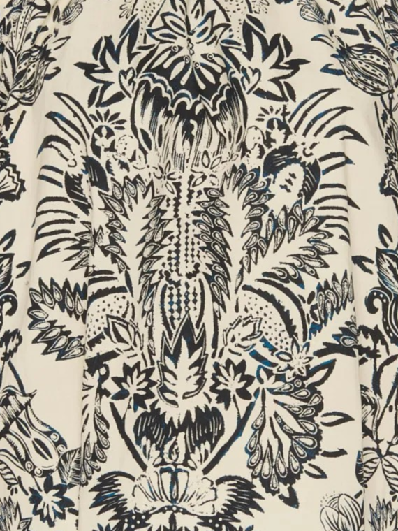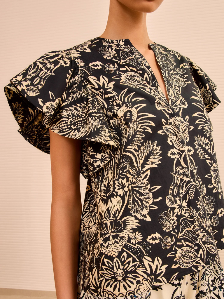 Crafted from cotton poplin, the Severine Top by Ulla Johnson is richly graphic with a symmetrical botanical print infused with subtle, batik textures. This black and ivory top features signature flutter sleeves and is loose in form for easy styling with denim or tailoring.
