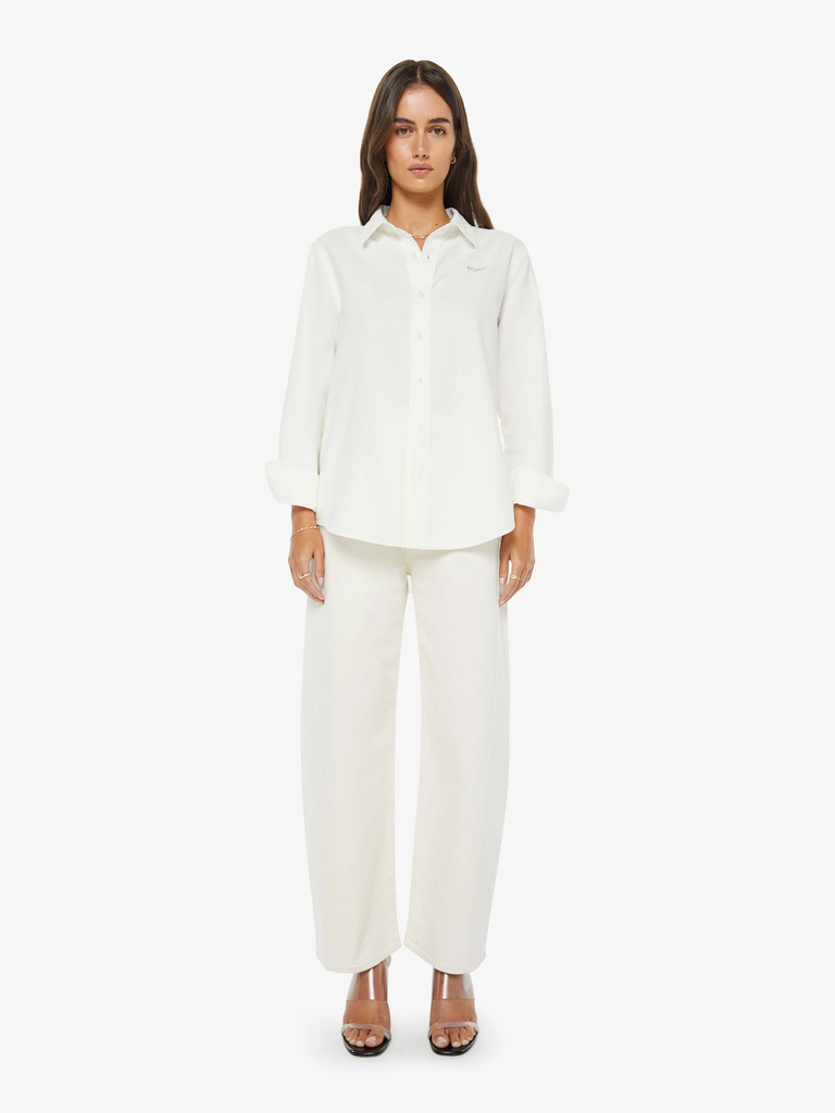 An expanded collection of foundational pieces designed for All Day, Every Day. Created for versatility, layering, and year-round wearability, these are the pieces you will never stop reaching for. A classic button-up by Mother Denim with a curved hem and MOTHER's name embroidered on the chest. Made from 100% cotton, The Bestie is designed in a warm white.