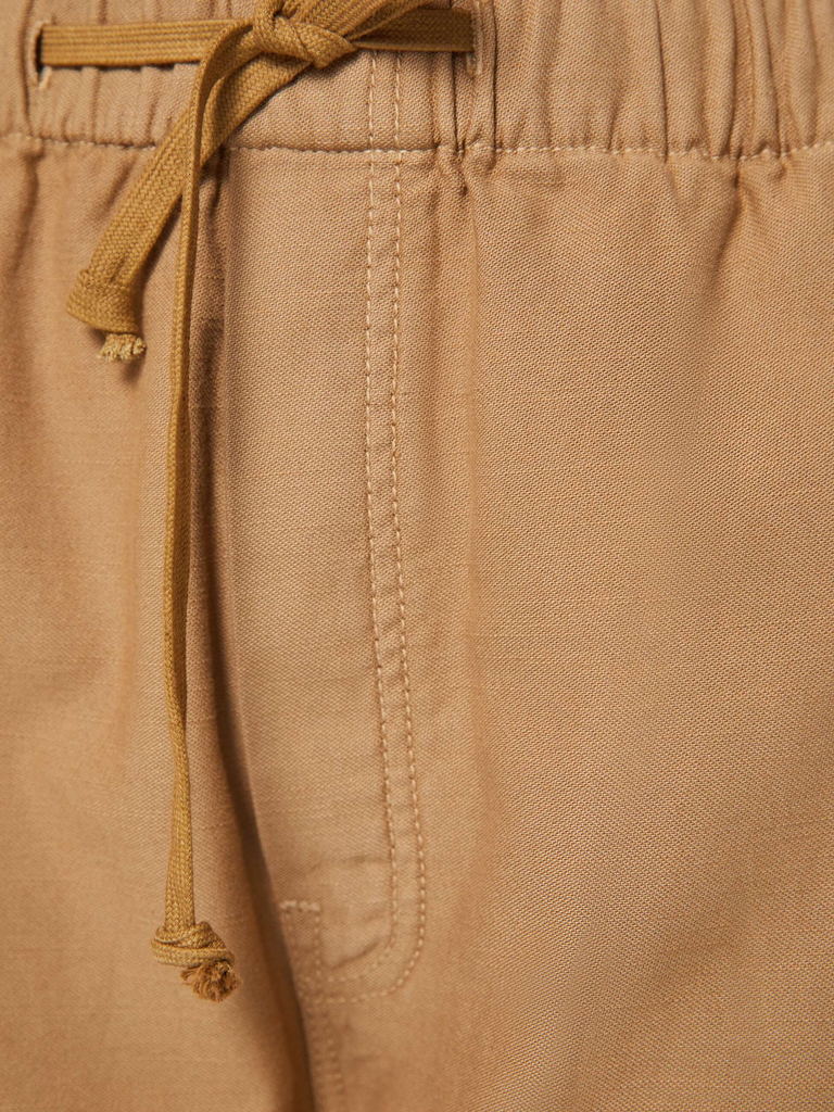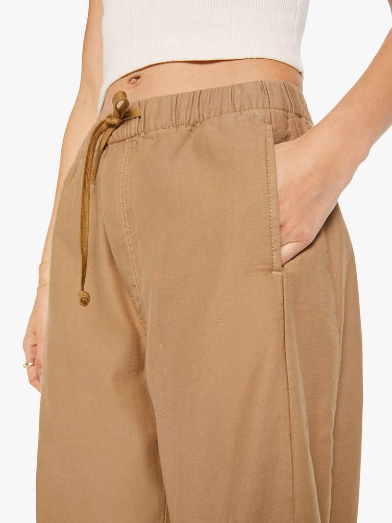 Super high-waisted pants by Mother Denim with a drawstring waistband, wide, curved leg, an ankle-length inseam and a clean hem. The pants are made from 100% cotton in khaki.