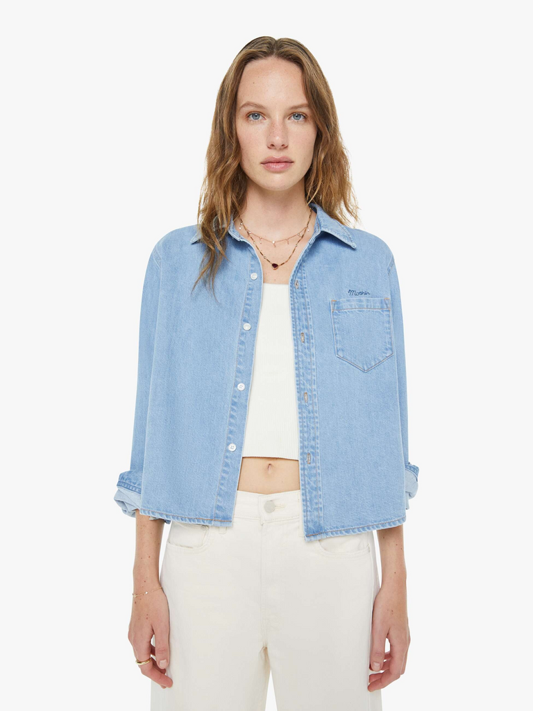 An expanded collection of foundational pieces designed for All Day, Every Day. Created for versatility, layering, and year-round wearability, these are the pieces you will never stop reaching for. A play on the classic button-up with a front patch pocket and a cropped fit. By Mother Denim, made from a SUPERIOR recycled cotton blend, Grand Slam is a light blue denim.