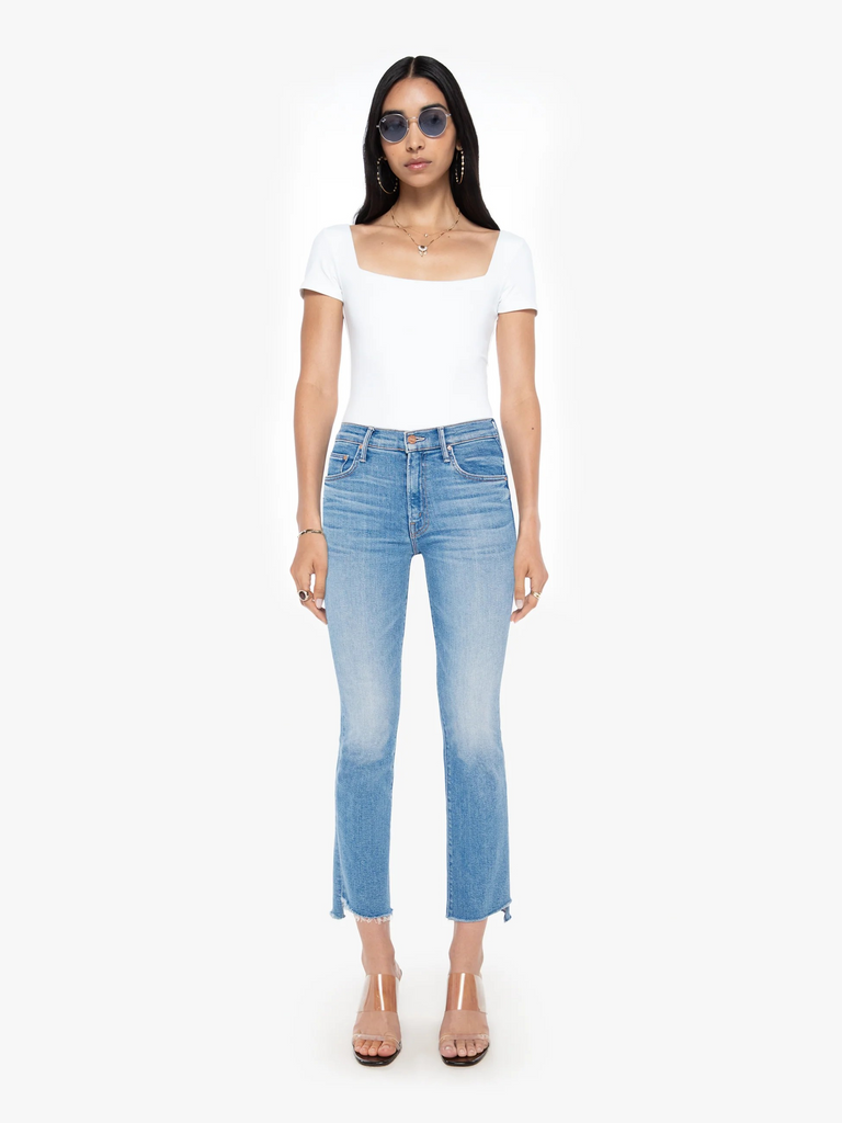 Color me surprised. This iconic high-waisted bootcut by Mother Denim is cropped at the ankle with a frayed step-hem. Made from stretch denim, Out Of The Blue is a mid-blue wash with whiskering and fading at the knee.