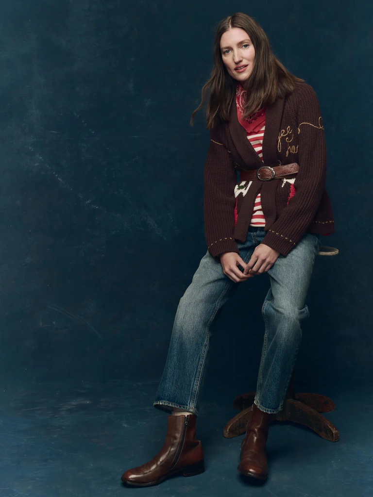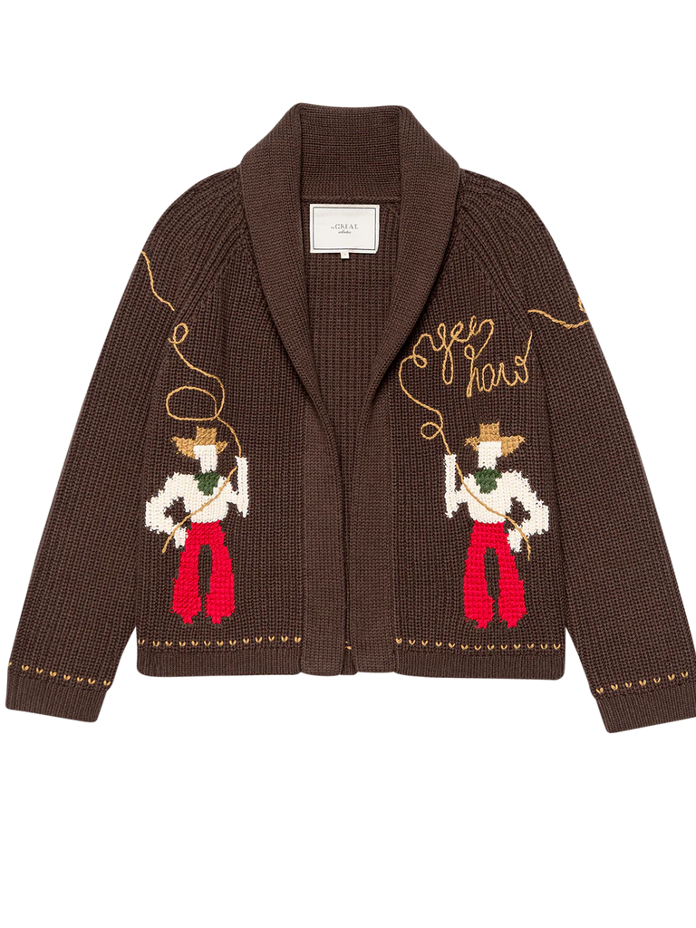 A reimagined version of their signature Lodge Cardigan, this piece by The Great features a hand-embroidered cowboy and lasso spelling out “yeehaw”—a playful detail inspired by a 1960s children’s sweater. Spun from a soft cotton blend yarn, it’s cozy, comfortable, and full of character. Designed with ease throughout the body. For a closer fit, we recommend sizing down.
