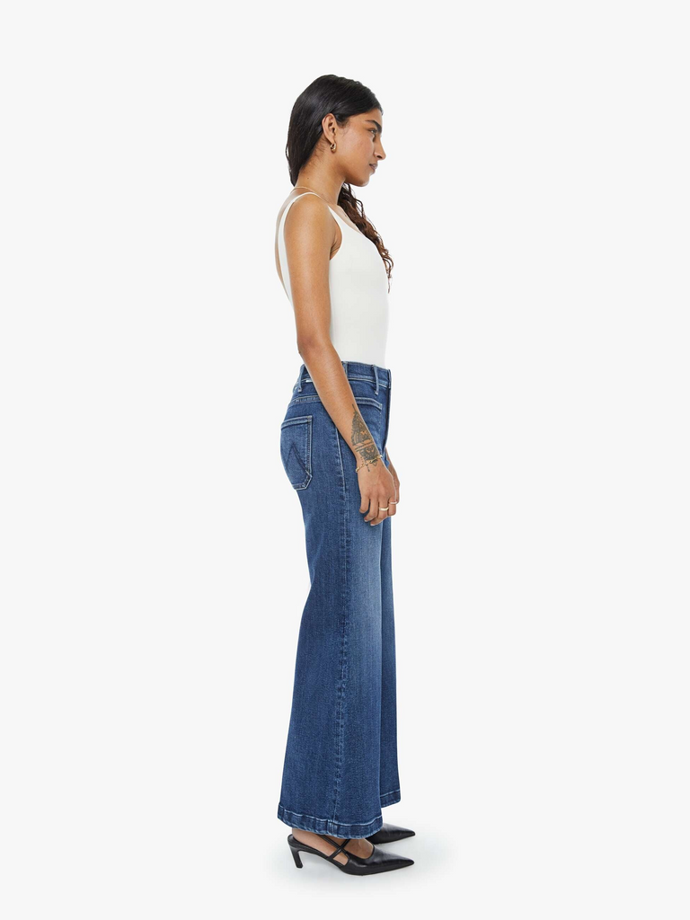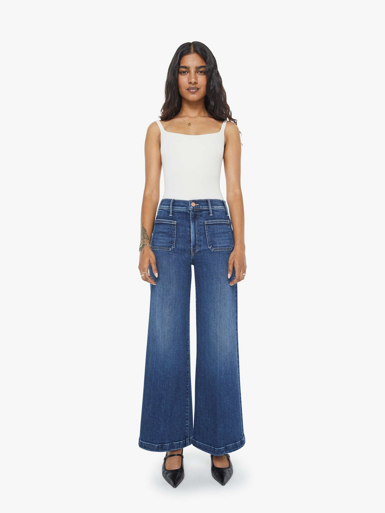 70s-inspired wide leg jeans by Mother Denim with a high rise, zip fly, patch pockets, 28-inch inseam and a clean hem. Made from stretch denim, One Last Shot is a dark blue with subtle whiskering and fading at the knees.