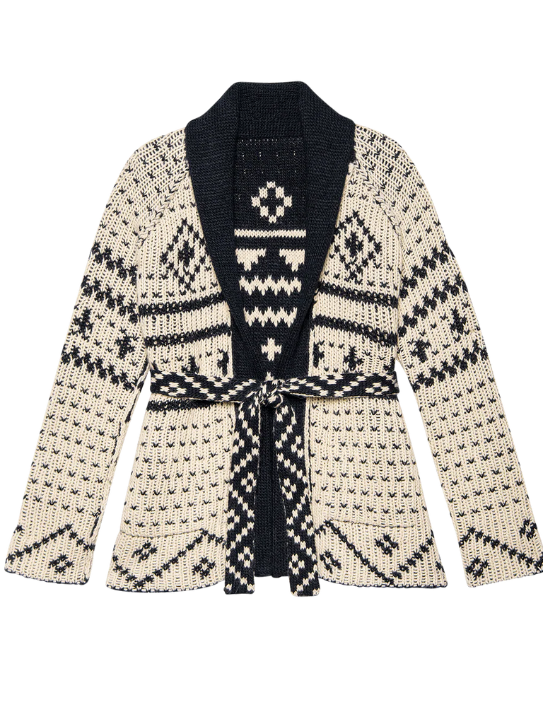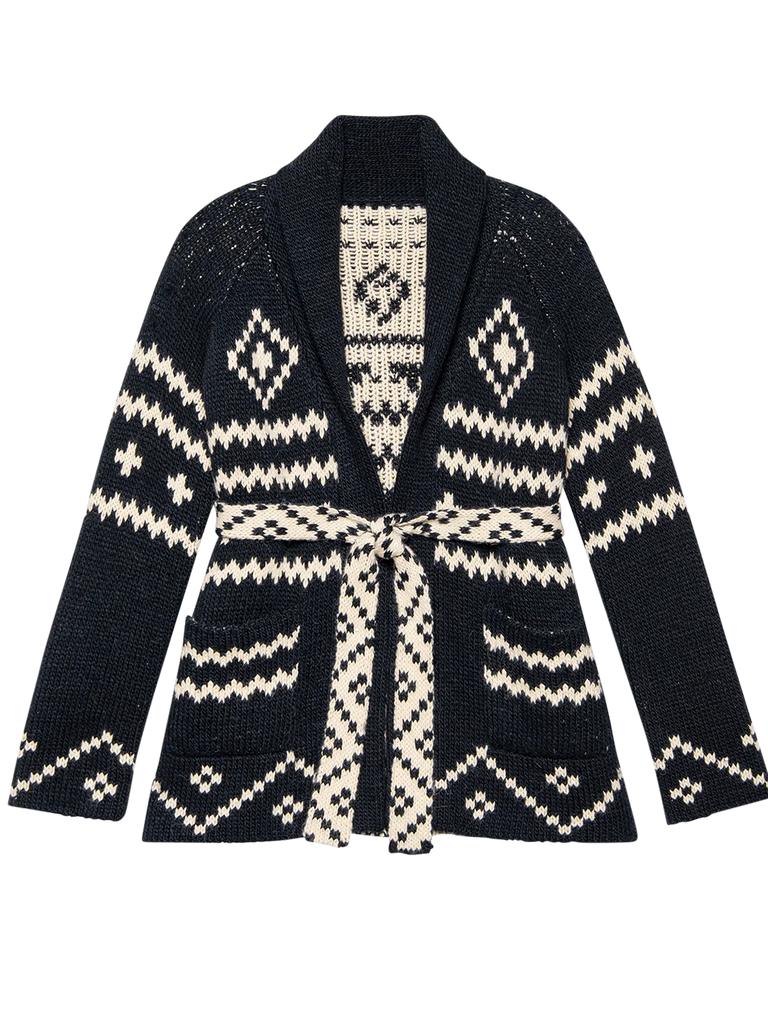 The Reversible Shepherd Cardigan by The Great is a longer-length shawl style spun from alpaca in a double jacquard technique for full reversibility. With raglan sleeves, no front closure, and a removable waist tie, it’s easy to wear two ways—on the cream side or navy side.
