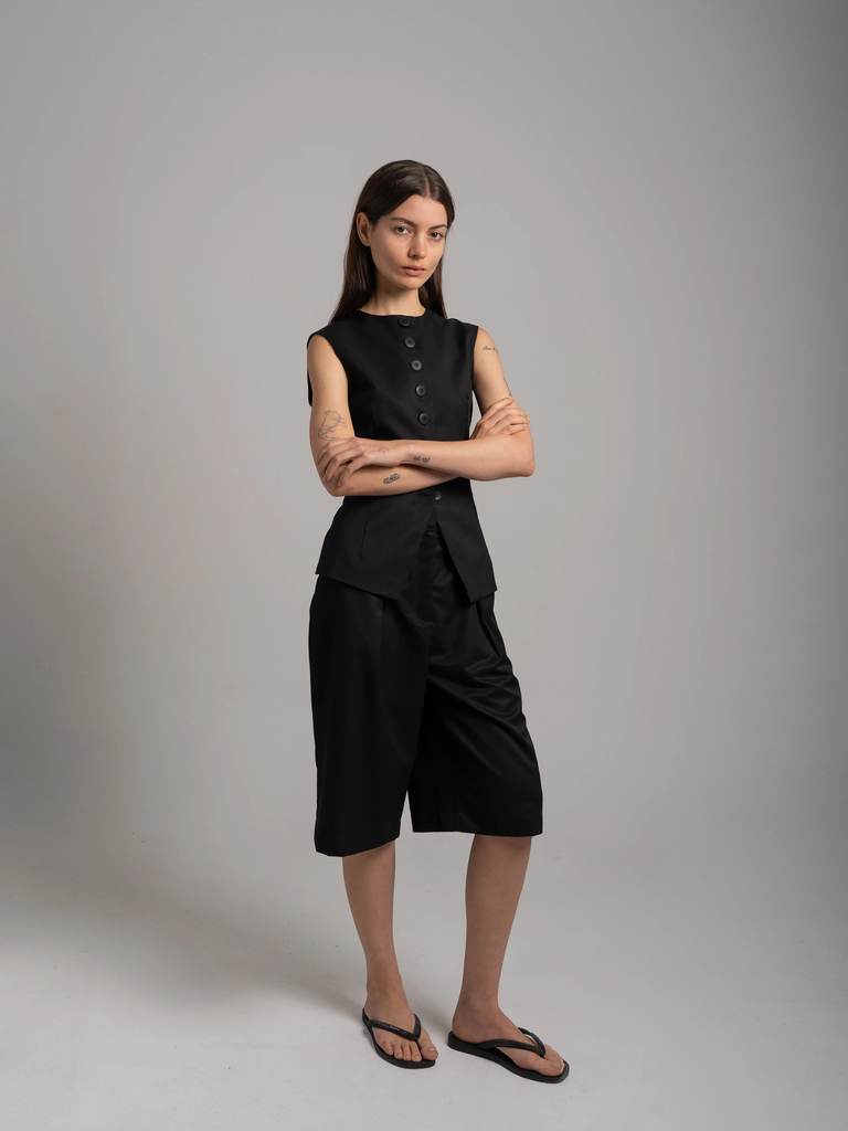 The new Sculpted Vest by SLOAN provides a versatile addition to your wardrobe that easily transitions from day to night. Play around with the buttons to match your mood and style. Pair it with our Wide Leg Trouser for a complete ensemble.