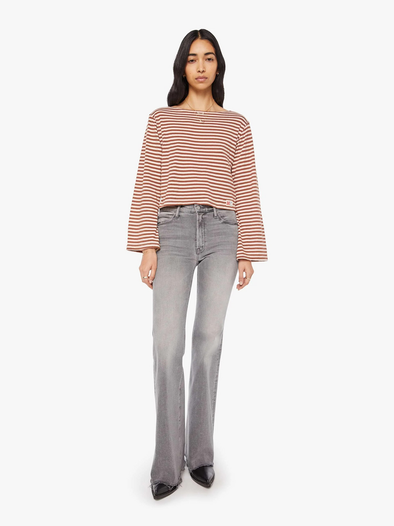 A long sleeve tee by Mother Denim with a boat neck and boxy fit. Made from stretch cotton, the top is designed in horizontal brown-and-white stripes.