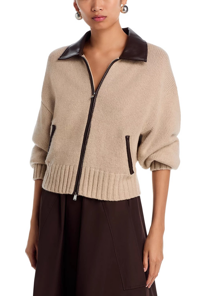 The Zofia Zipper Cardigan by Simkhai offers a leather spread collar, zipper closure front, slant pockets and leather trim at zipper and pockets.
