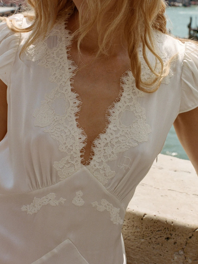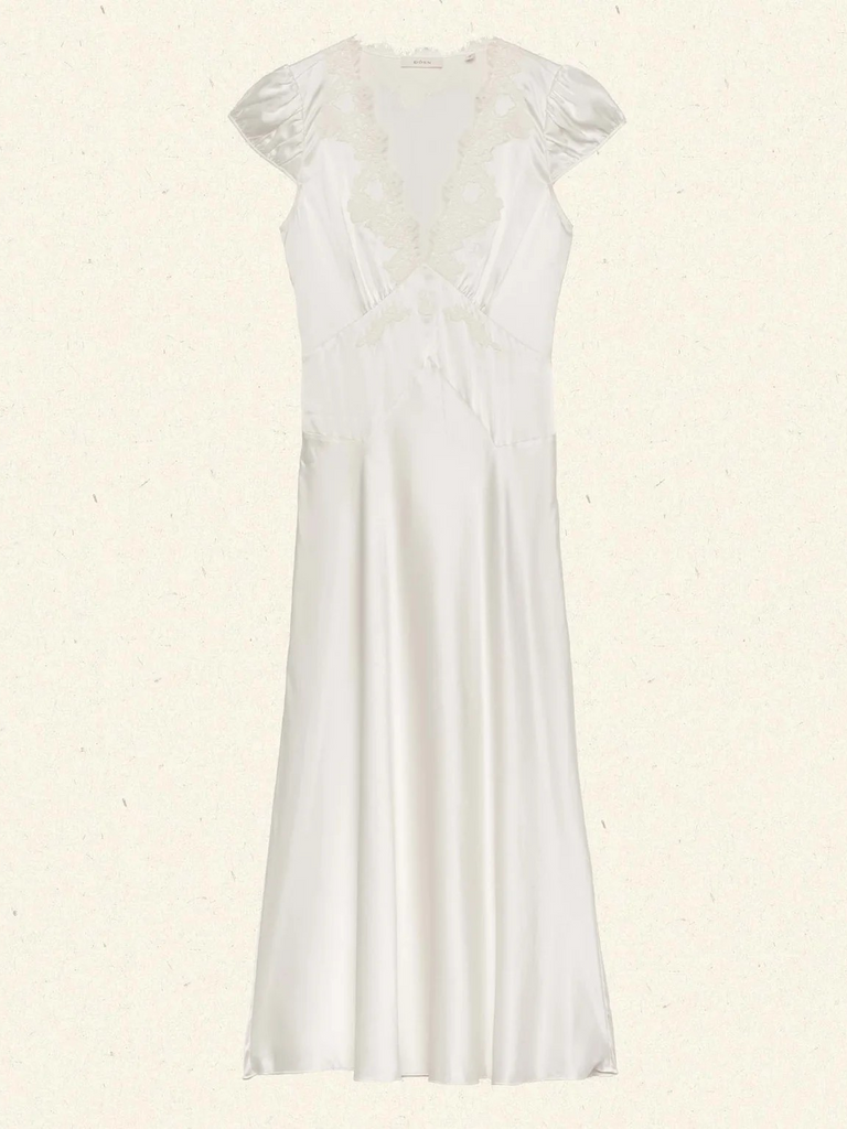 In buttery silk satin, the ‘30s-inspired Coraline Dress by DÔEN features gathered cap sleeves and a plunging V-neckline adorned with intricate embroidered scallop lace. A fitted bodice with an invisible side seam zipper and adjustable back waist tie gives way to a midi-length, bias-cut skirt, while an embroidered “D” at the bust adds a sweet finishing touch.