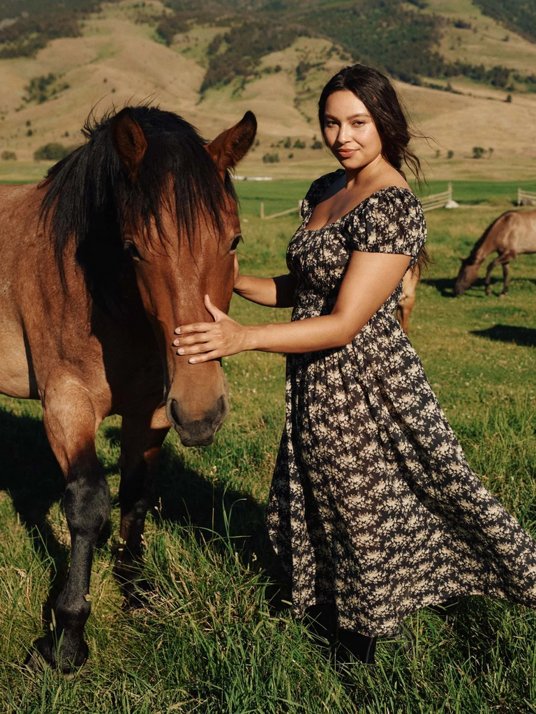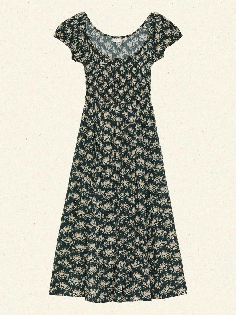 Crafted from soft, midweight organic cotton voile and rendered in their Victorian-inspired Rosier Floral print, the Quinley Dress by DÔEN features a scoop neckline, gathered bust, and short puffed sleeves. A smocked, fitted bodice gives way to an ankle-grazing A-line skirt.