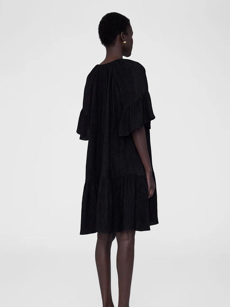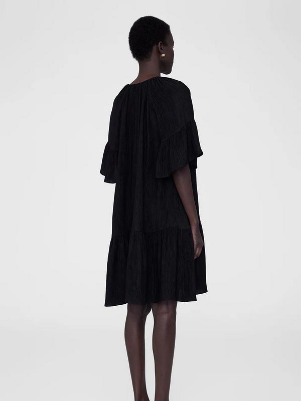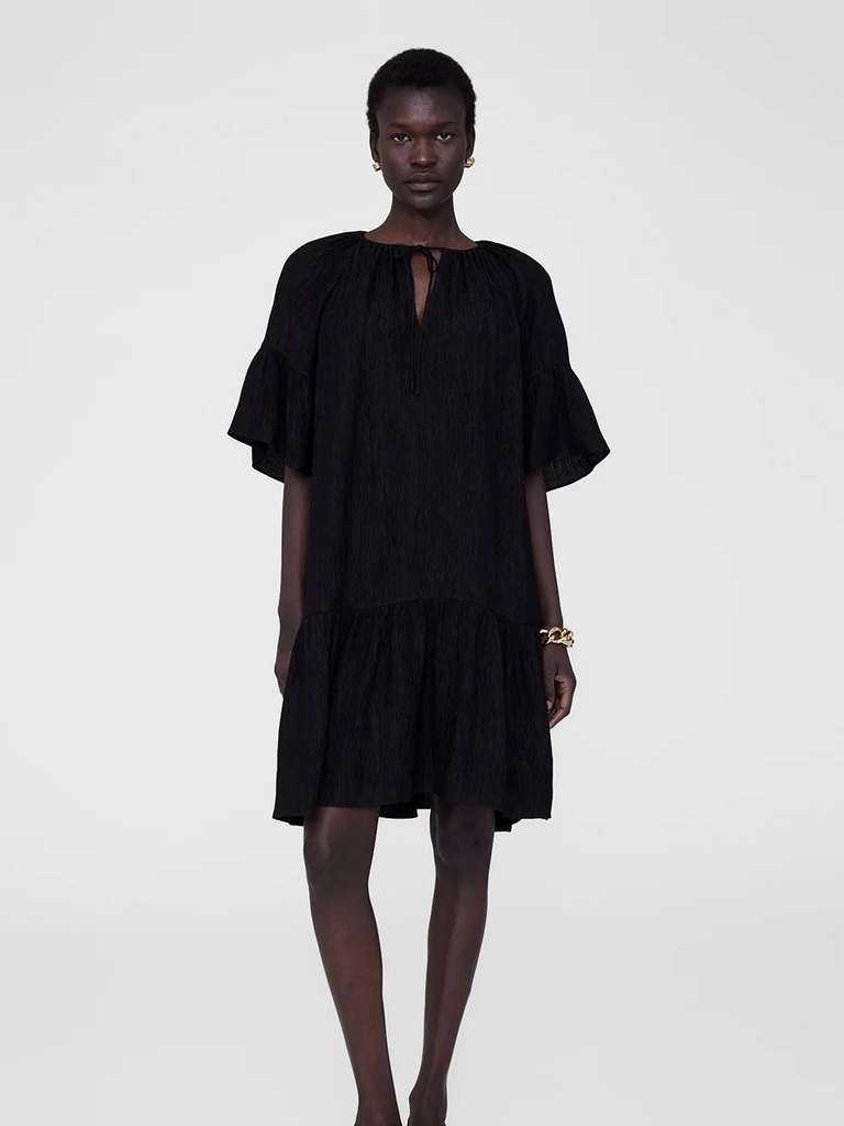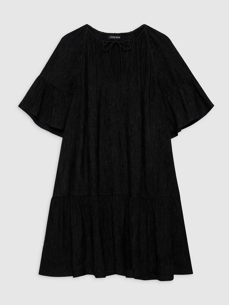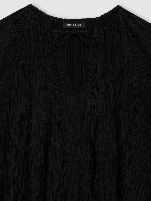 A relaxed minidress crafted from a lightweight, vertical pleated knit fabrication with a dry yet soft hand. The Lolita Dress by Anine Bing features long short sleeves and a high crew neckline with an adjustable tie detail at the center front.