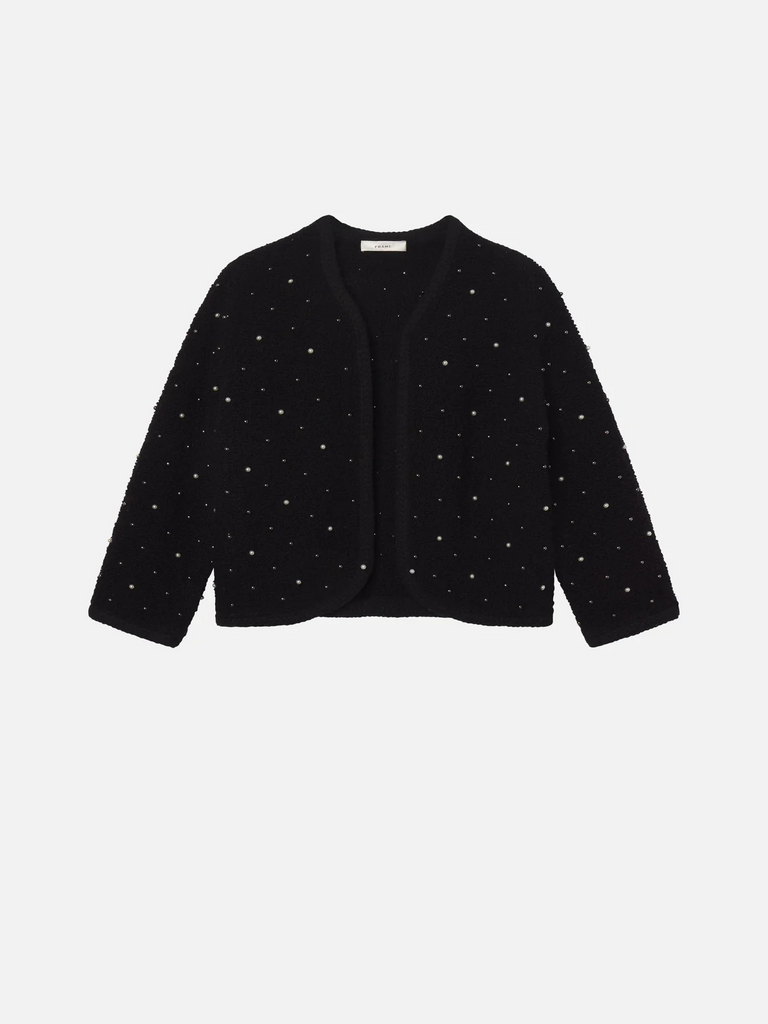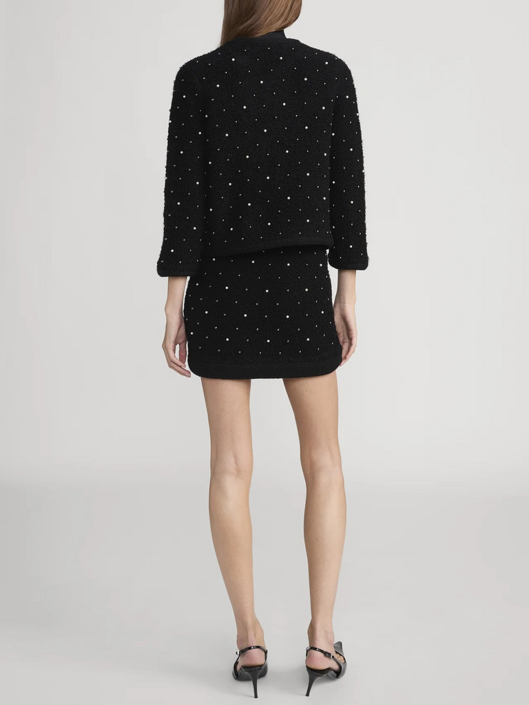 This classic yet modern knit by FRAME is embellished with pearls and rhinestones throughout. The silhouette features delicate three-quarter length sleeves and no closure. Pair with The Embellished Skirt for the full look.