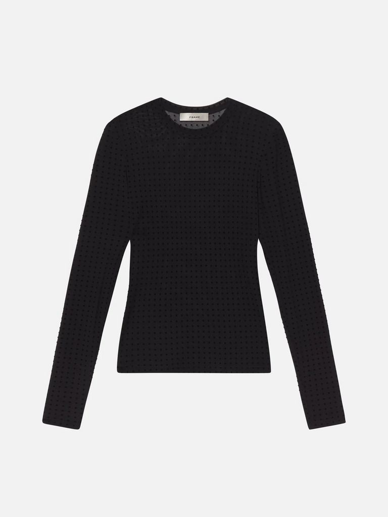 A team favorite by FRAME from their latest collection, this sheer, form-fitting top features all-over matte polka dots. Polished with a playful side, The Mesh Polka Dot top makes the perfect layering piece.