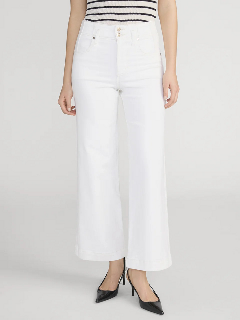 The Seamed Wide Trouser Crop by FRAME is crafted in super-stretch denim, this cropped trouser silhouette has a flattering high-rise waist, subtle contrast stitching and vertical pocket seams. Finished with a vintage-inspired double-button closure.