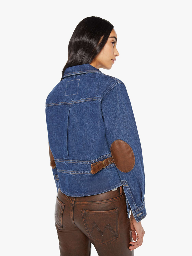 RV there yet? A zip-up denim jacket by Mother Denim with a notched collar, slit pockets and a cropped fit. Made from 100% cotton denim, Weekend Out West features brown faux-leather patches on the shoulders and adjustable tabs at the waist.