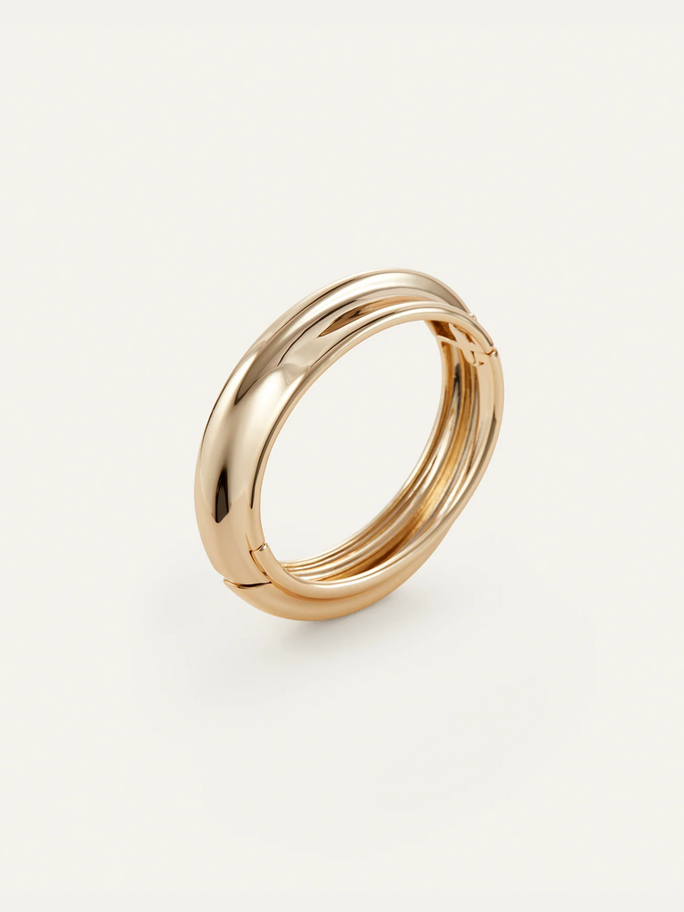An organically-shaped bangle that boasts deep contours. This custom bracelet opens and closes with a hinge and tab lock closure. To open, push down on the highest point of the clasp before pulling the bracelet open. To close, listen for a "click" to ensure tab is locked properly. Finished in high-polish gold.