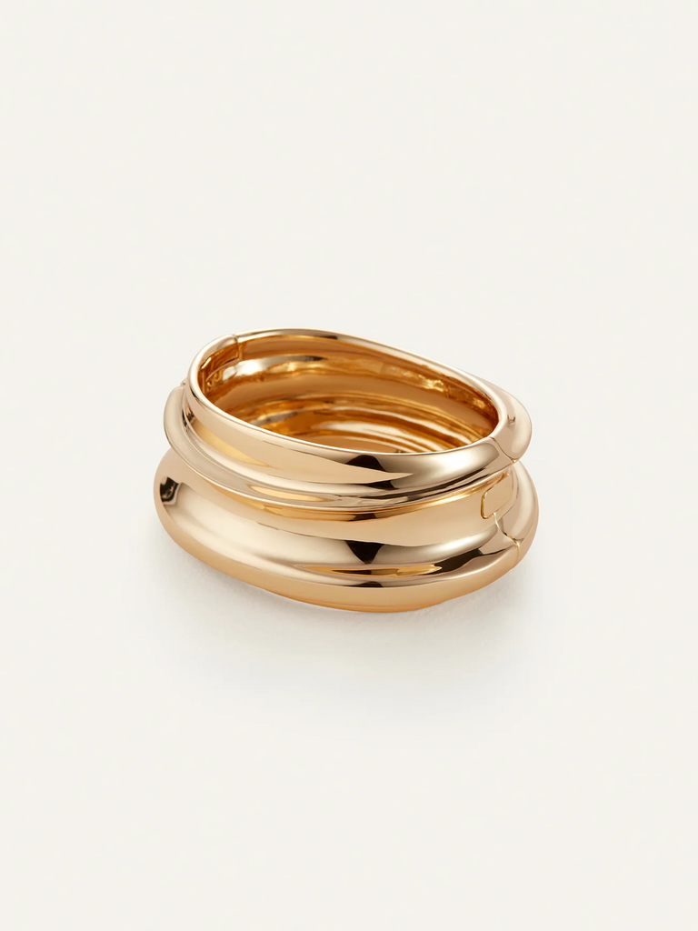 A dramatic statement bangle that boasts deep contours. This custom bracelet opens and closes with a hinge and tab lock closure. To open, push down on the highest point of the clasp before pulling the bracelet open. To close, listen for a "click" to ensure tab is locked properly. Finished in high-polish gold.