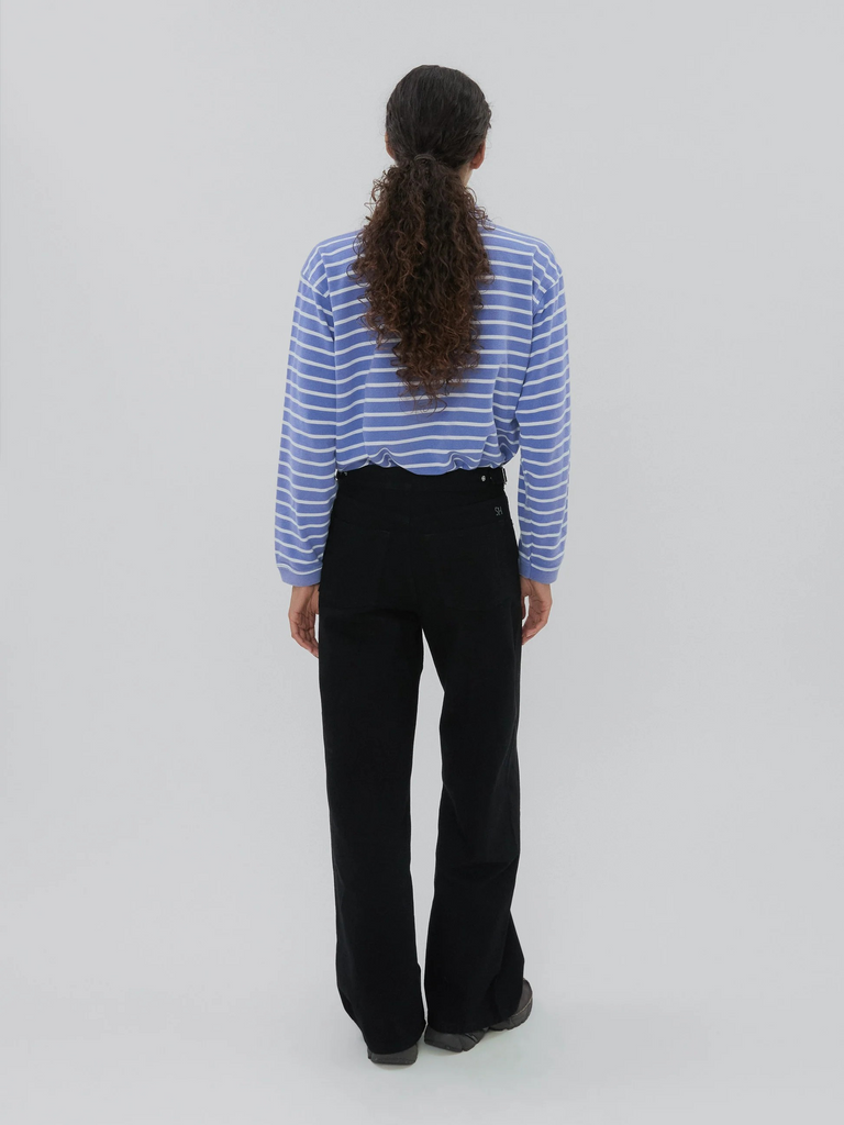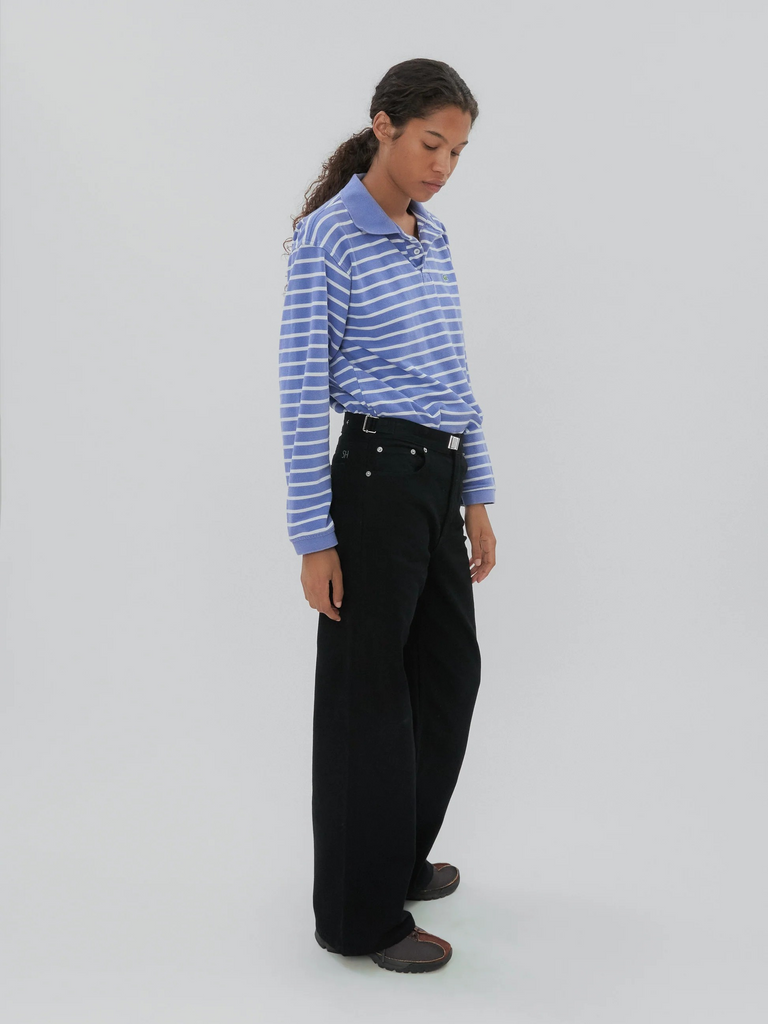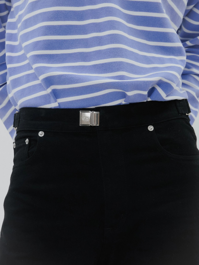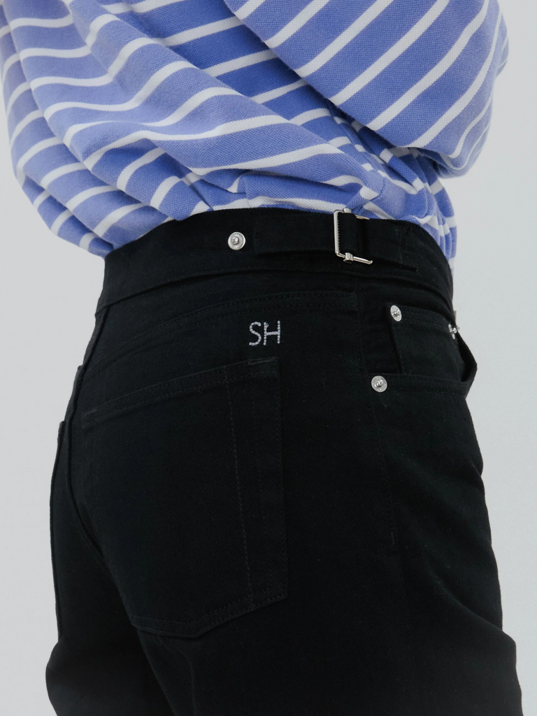 The Buckle Jean by STILL HERE is a relaxed leg, subtle drop-crotch jean. It features a custom chrome buckle hardware and adjustable waistband side fasteners, allowing it to be worn as both a mid or low-rise jean. Complete with a classic zipper fly and the signature 'SH' embroidery.