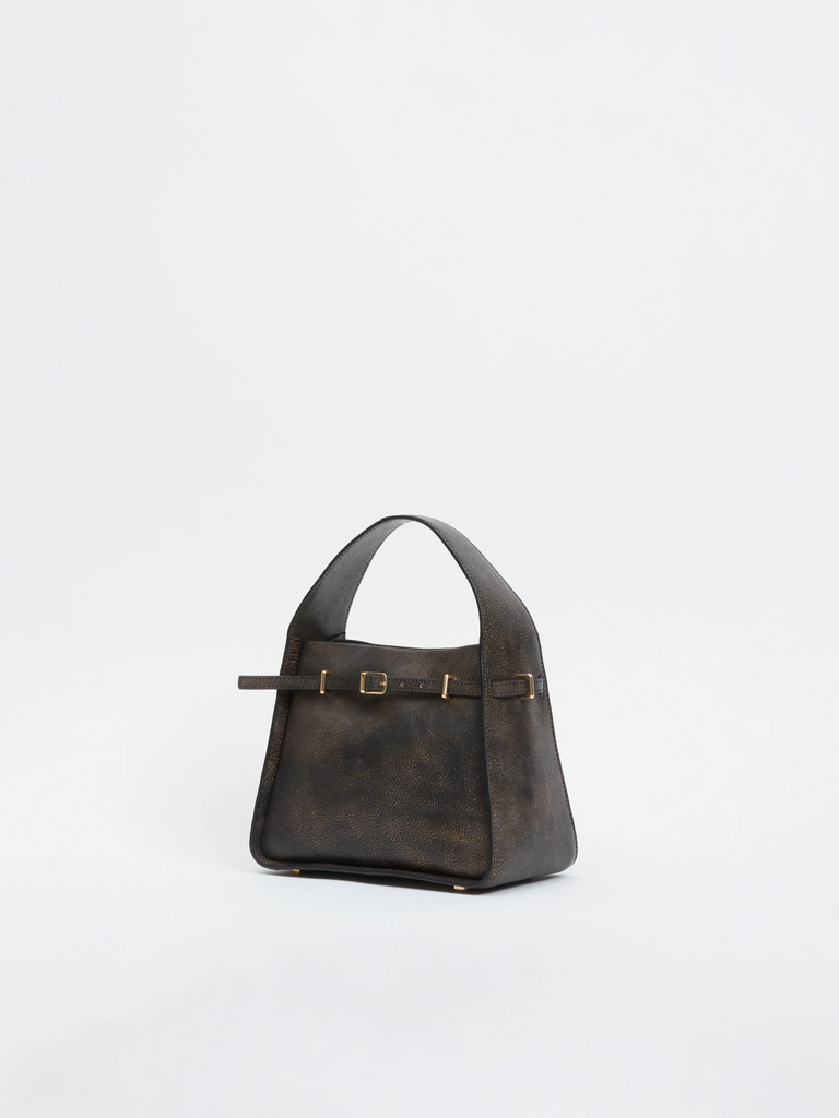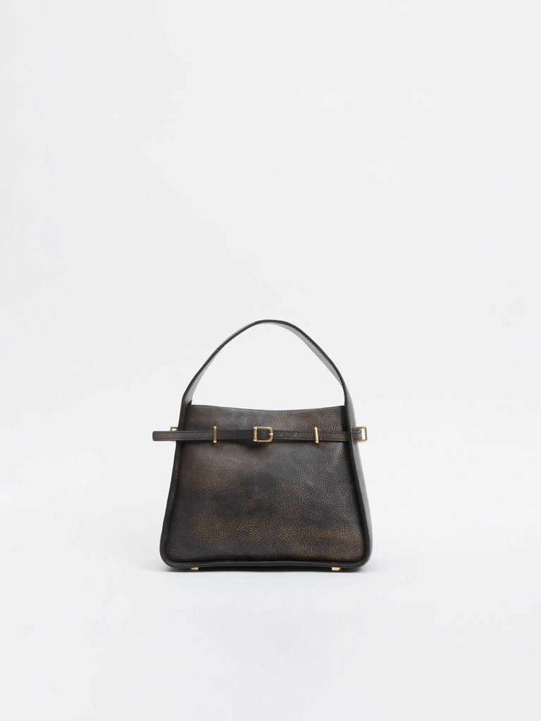 A structured mini bag by Simkhai in Ivy suede with a belted detail and antique gold hardware. Finished with a top handle and optional shoulder strap.