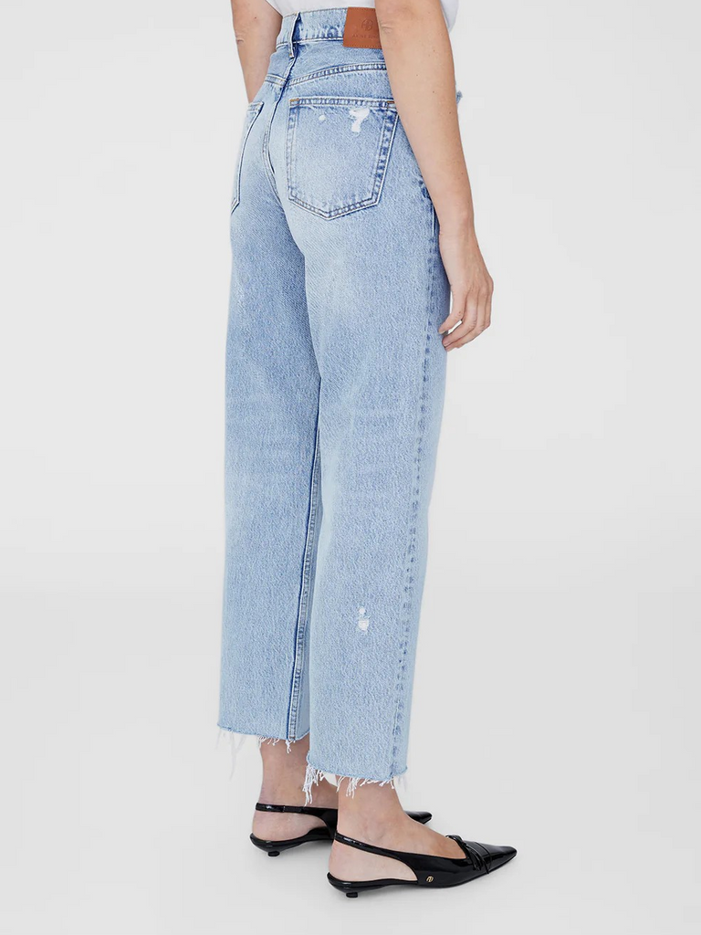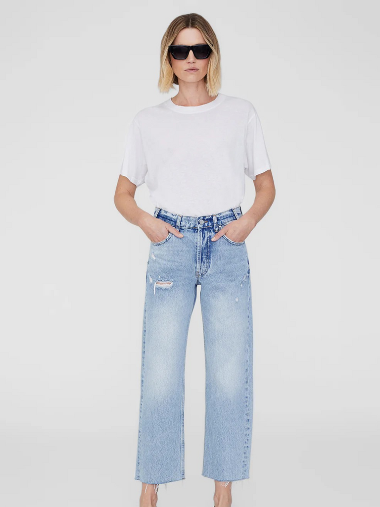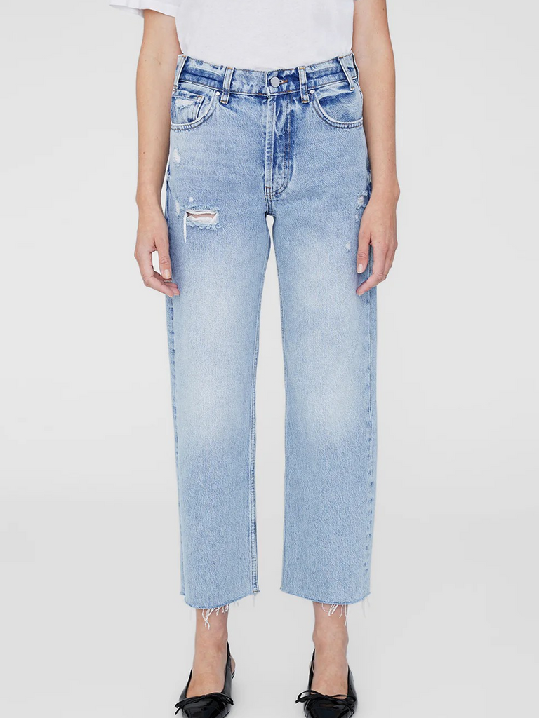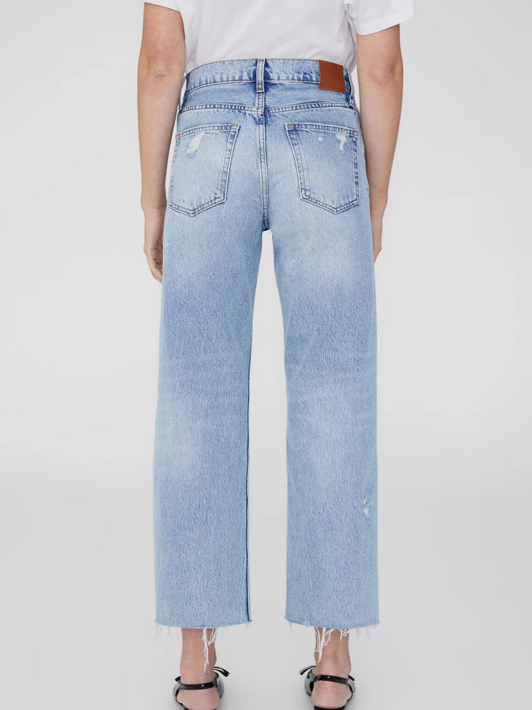 The cropped, boyfriend-inspired Gavin Jean by Anine Bing is constructed from heavyweight rigid cotton denim without stretch in a faded, light blue wash with grinding at both back pockets, marbling, and vintage-inspired highs and lows throughout.