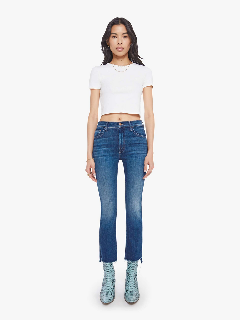 Up to no good. This iconic high-waisted bootcut by Mother Denim has a zip fly, ankle-length inseam and a frayed step-hem. Made from a blend of recycled stretch denim, Troublemaker is a mid-blue with whiskering and fading at the knees.