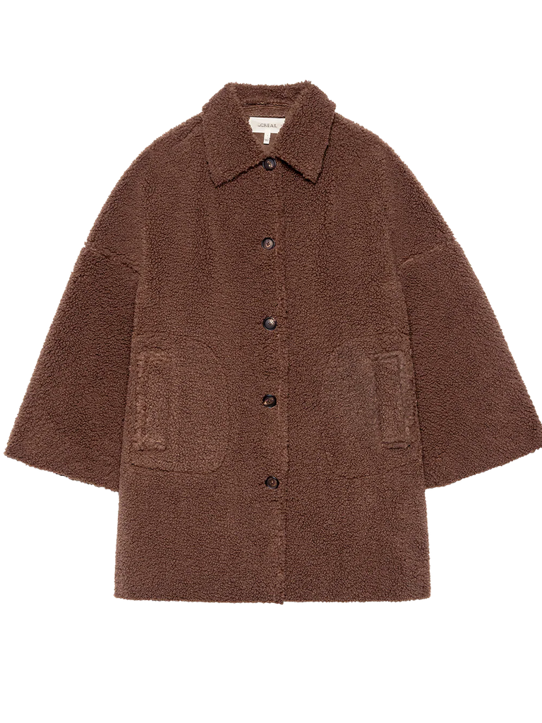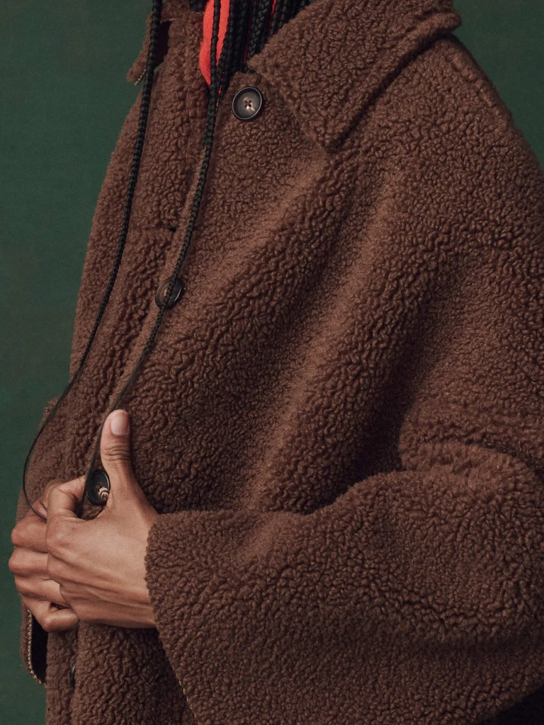 Oversized enough to layer over a chunky knit but still tailored enough to cut a sleek silhouette, The Plush Car Coat by The Great makes a cozy statement. Cut from chocolate colored bonded fleece fabric that’s plush on one side and soft and smooth on the inside, the coat is inspired by a clean cut 1950’s silhouette with dropped shoulders, angled armholes, cropped sleeves, collar, welt pockets, and sophisticated horn buttons up the front. All seams are cut and finished with a pinked micro-zigzag edge.