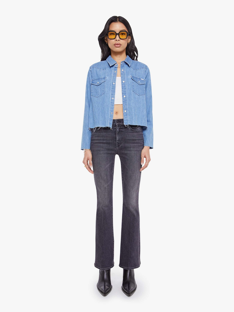 Yours for the taking. A Western-inspired denim button-up by Mother Denim with front patch pockets and a cropped, raw hem. Made from 100% cotton, Playing For Keeps is a faded vintage-blue with faux pearl snaps down the front.