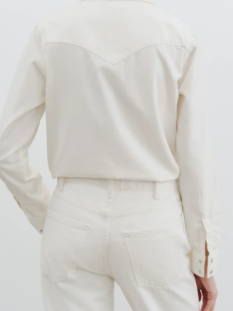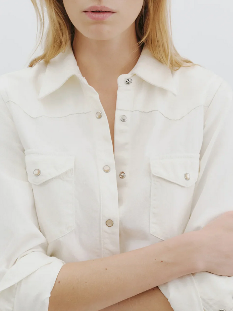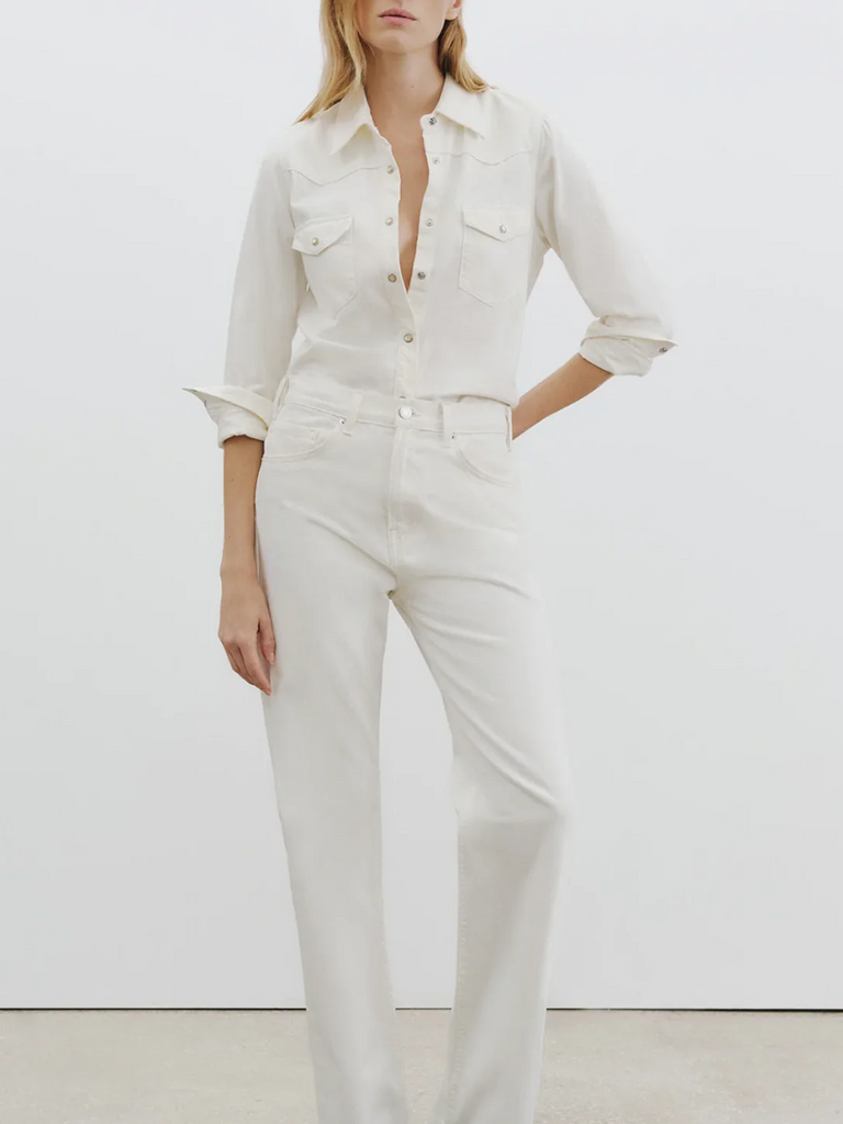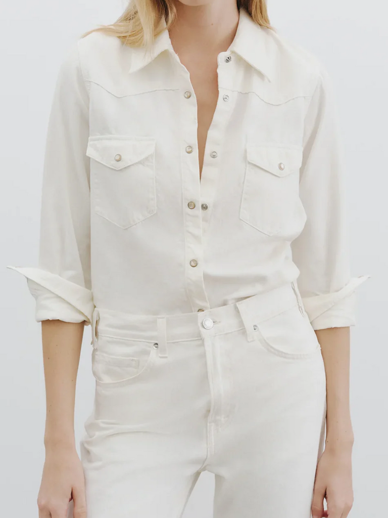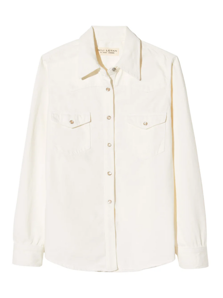 Classic, straight fit collared jean shirt in Japanese denim by Nili Lotan. Western details. Pearl snap buttons. Chest flap pockets. Standard placket. Center front buttons. Buttons at cuff.