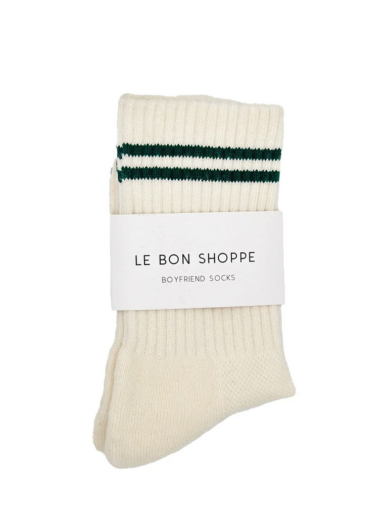 A signature style and year-round bestseller - the Boyfriend Socks by Le Bon Shoppe capture a sporty vintage charm made for everyday wear. This slightly longer-than-crew sock features a contrast double stripe, mesh along the top of the foot for breathability, and elastic arch support. Durable, comfortable, and perfect for pairing with any shoe.