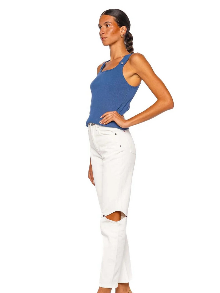 The Snap Tank by STILL HERE is constructed of thick ribbed cotton and features functional silver snaps for adjustable strap length.