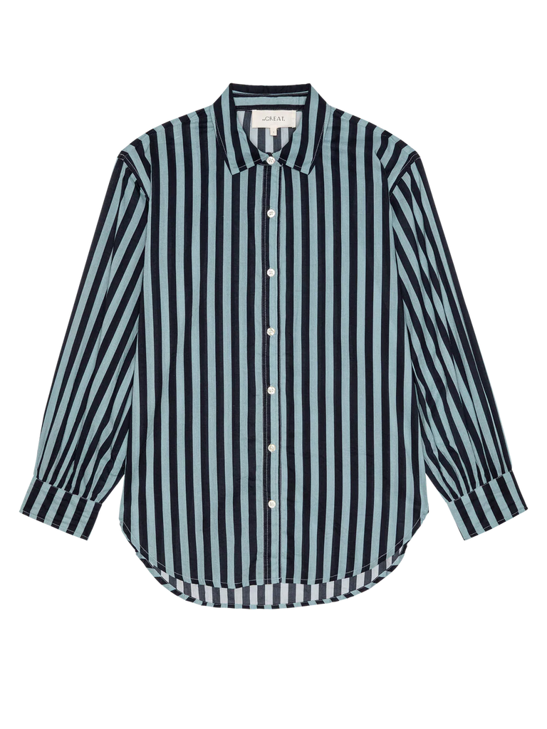 Inspired by classic menswear shirting from the 1940s, The Daily Button Up by The Great is a timeless button-up designed with an intentionally oversized fit for effortless styling. A shirttail hem and extended length make it ideal for layering or tucking into trousers, while considered tailored details—like a crisp shirt collar, structured cuffs, and delicate shirting buttons—lend a refined finish. This season, it’s crafted from lightweight cotton and finished with an iconic stripe reminiscent of classic American heritage style