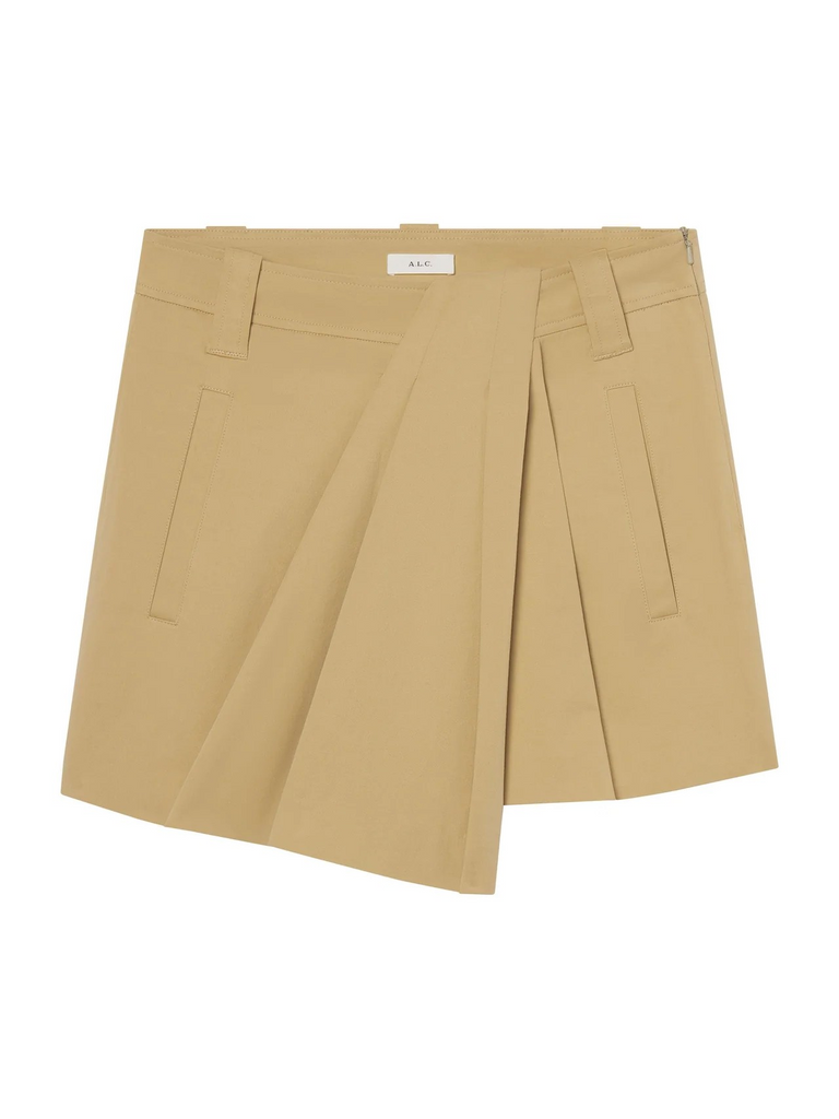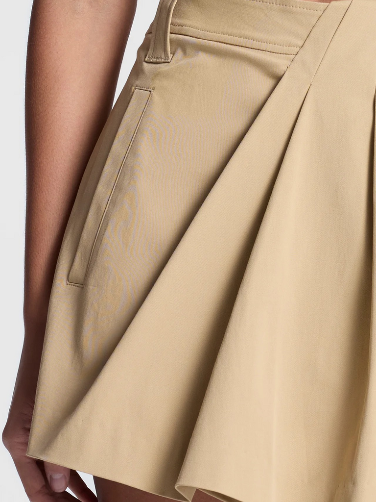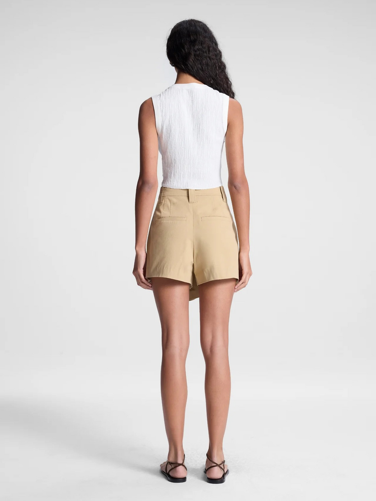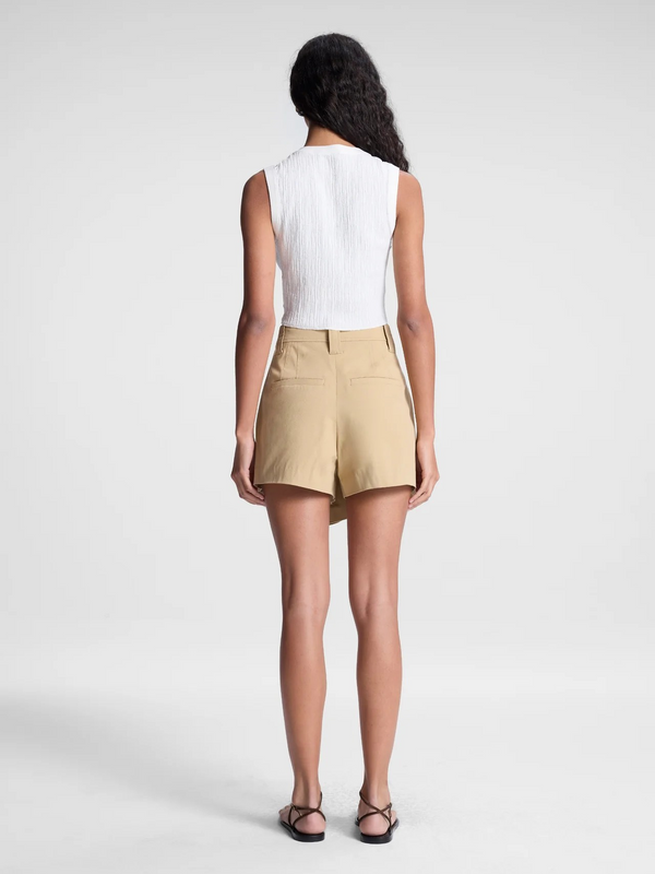 The Brody Short by ALC is crafted from their soft cotton gabardine — a refined Italian fabric produced in Tuscany using select raw materials, with meticulous spinning, weaving, dyeing, and finishing to achieve its smooth, breathable feel — in desert beige. This high-rise silhouette blends tailored polish with utilitarian influence, featuring slash pockets, a clean back with welt details, and front pleats that drape over a hidden short for a skort-style finish.
