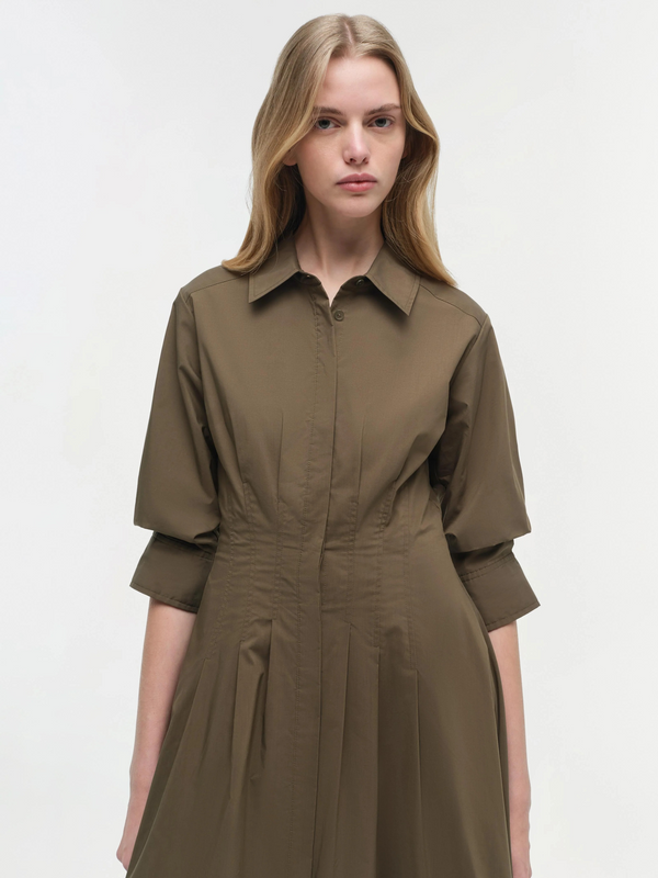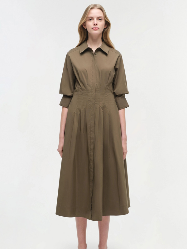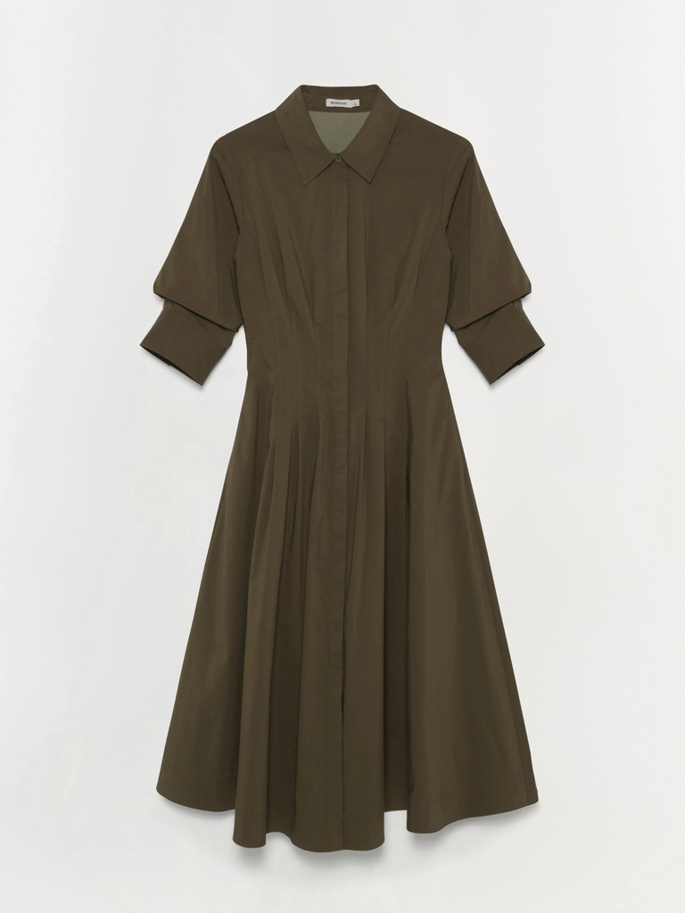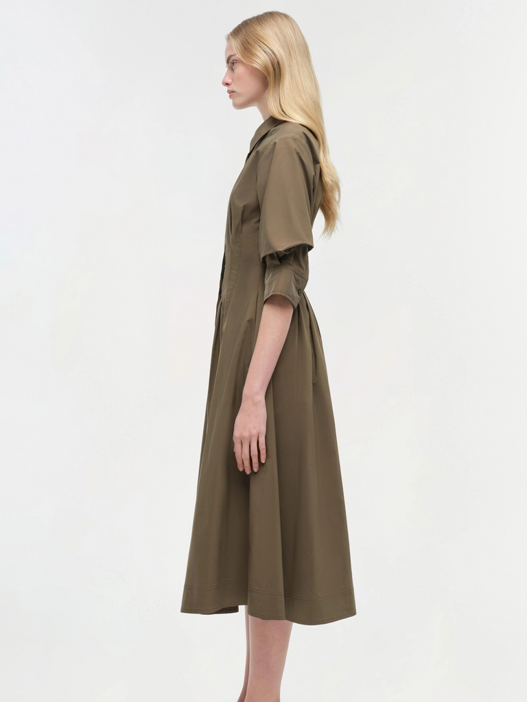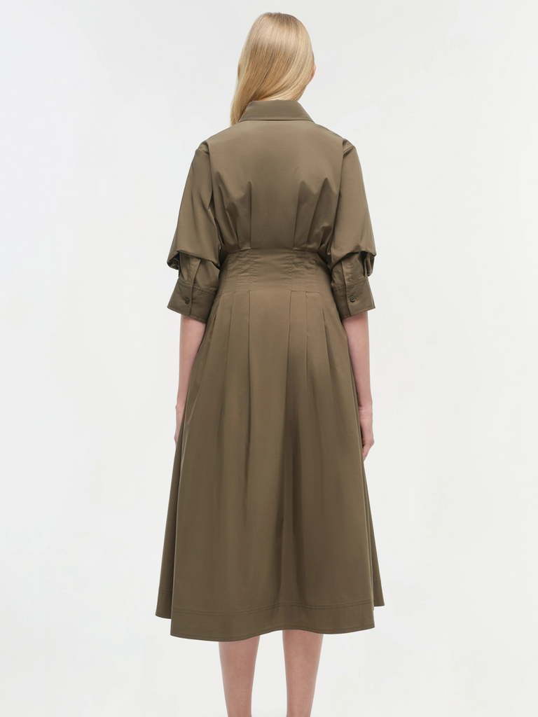 A midi dress by Simkhai that gives new consideration to the time-honored shirtdress. Structured cotton poplin creates clean lines allowing the creased elbow sleeves, pleated waist, and full skirt to sit with purpose.