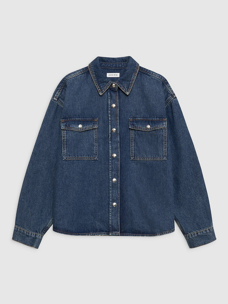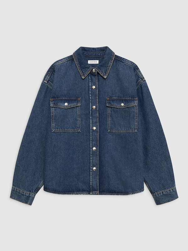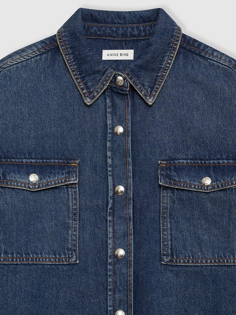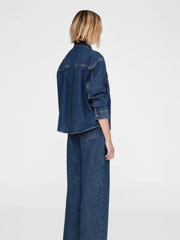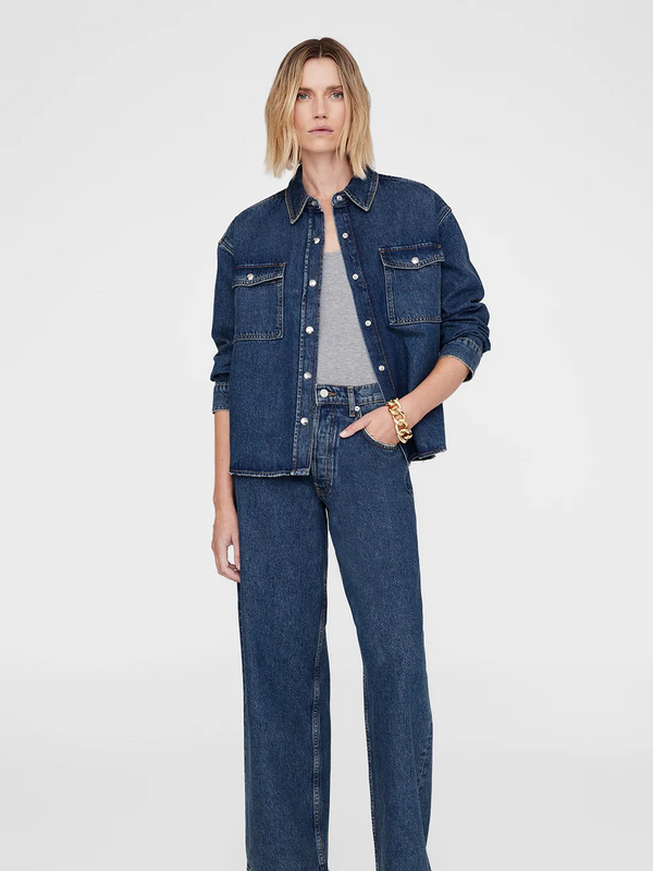 The Paxton Shirt by Anine Bing is constructed from a midweight, rigid cotton denim blend without stretch in a deep sea blue wash for a clean, vintage look. This modern workwear staple features wide shoulders, two patch pockets at the chest and front placket complete with branded snap buttons.