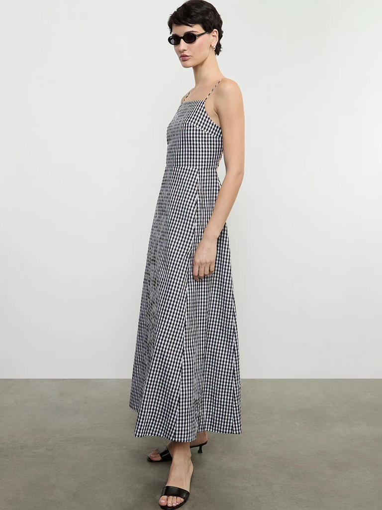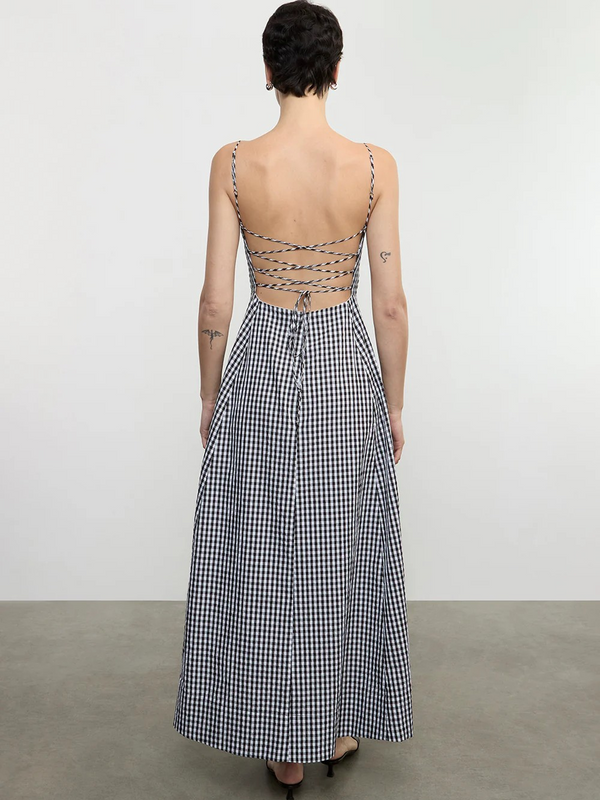 This black-and-white gingham maxi dress by Enza Costa features a square neckline, delicate spaghetti straps and an open-back lace-up detail. The silhouette has a tailored bodice with soft A-line skirt. It features side pockets and a wide hem.